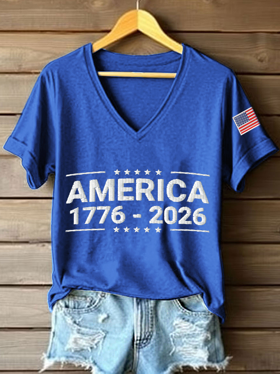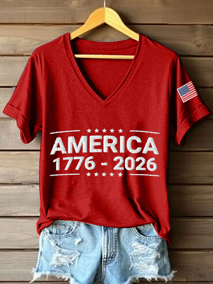 Women's America 1776-2026 Embroidery Pattern V-Neck T-Shirt