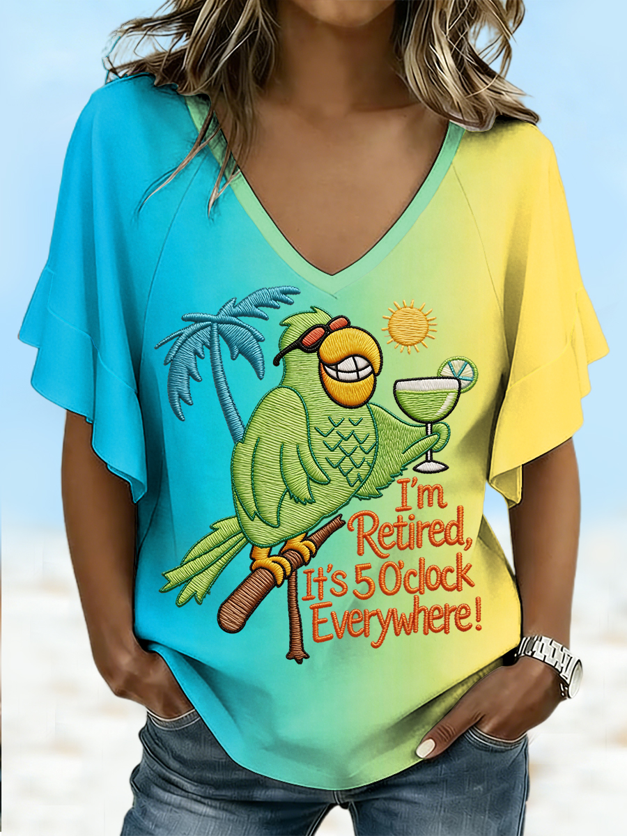Women's I'm Retired, It's 5 O'clock Everywhere Parrot Print Casual Ruffle Sleeve V-Neck Tee