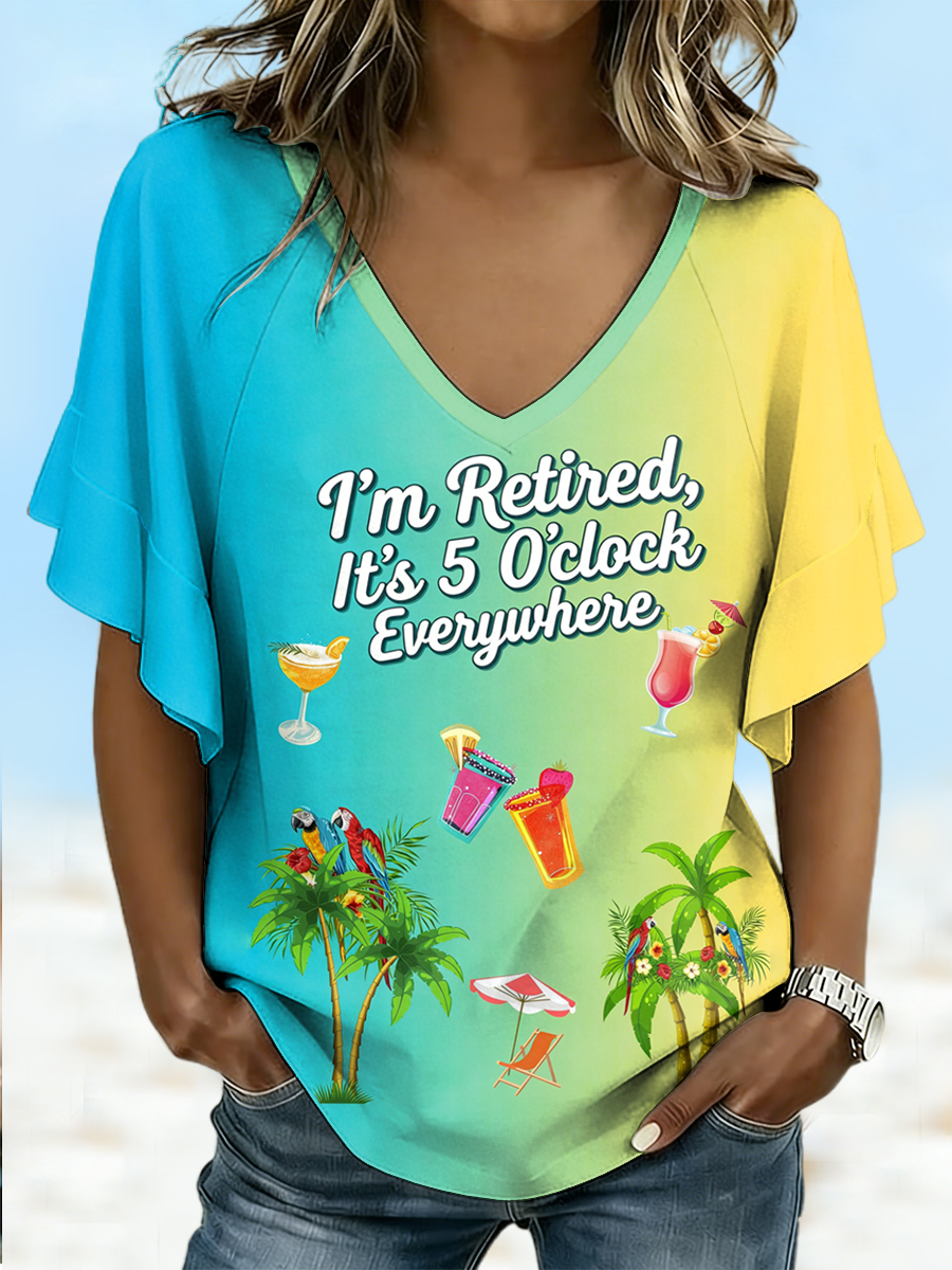 Women's I'm Retired, It‘s 5 O'clock Everywhere Gradient Print Casual Ruffle Sleeve V-Neck Tee