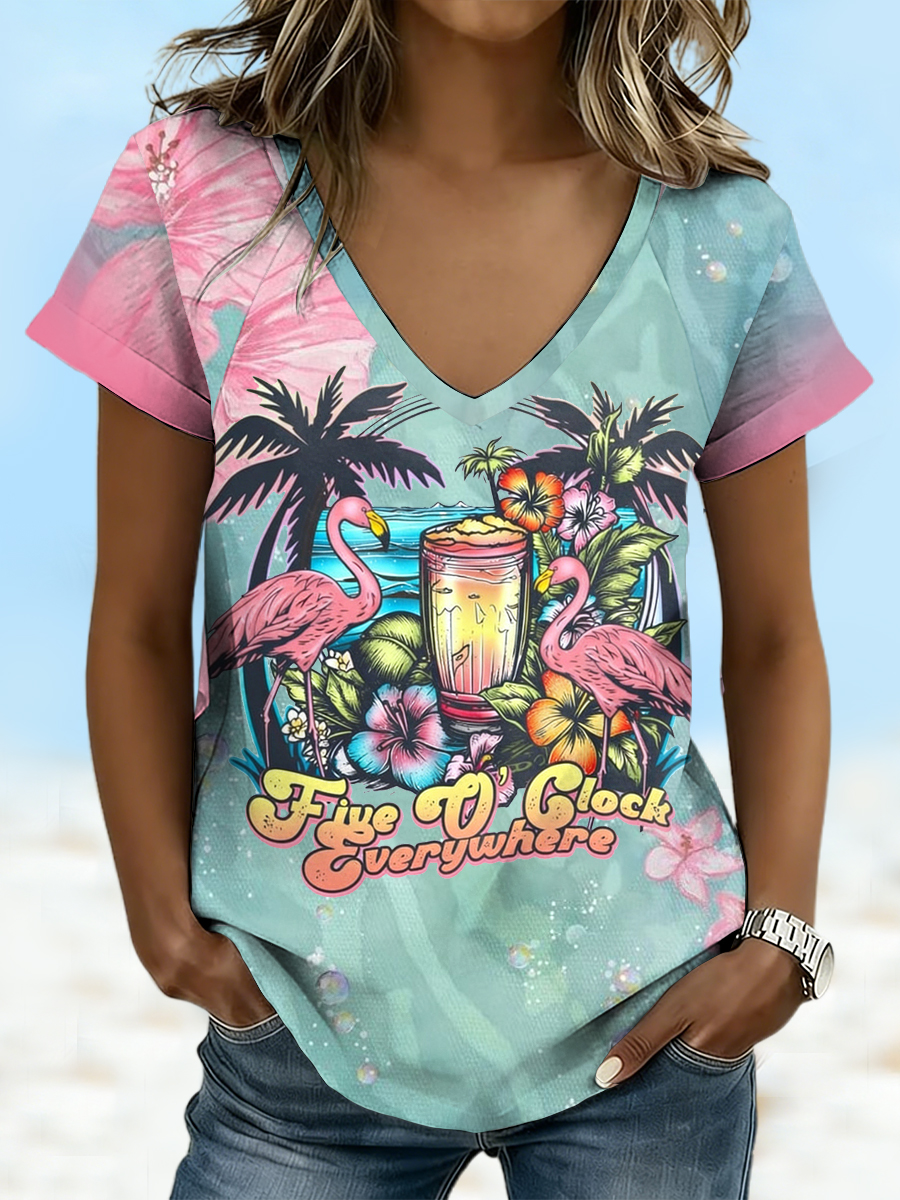 Women's I'm Retired It's 5 O'clock Everywhere Parrot Print Casual V-Neck Tee