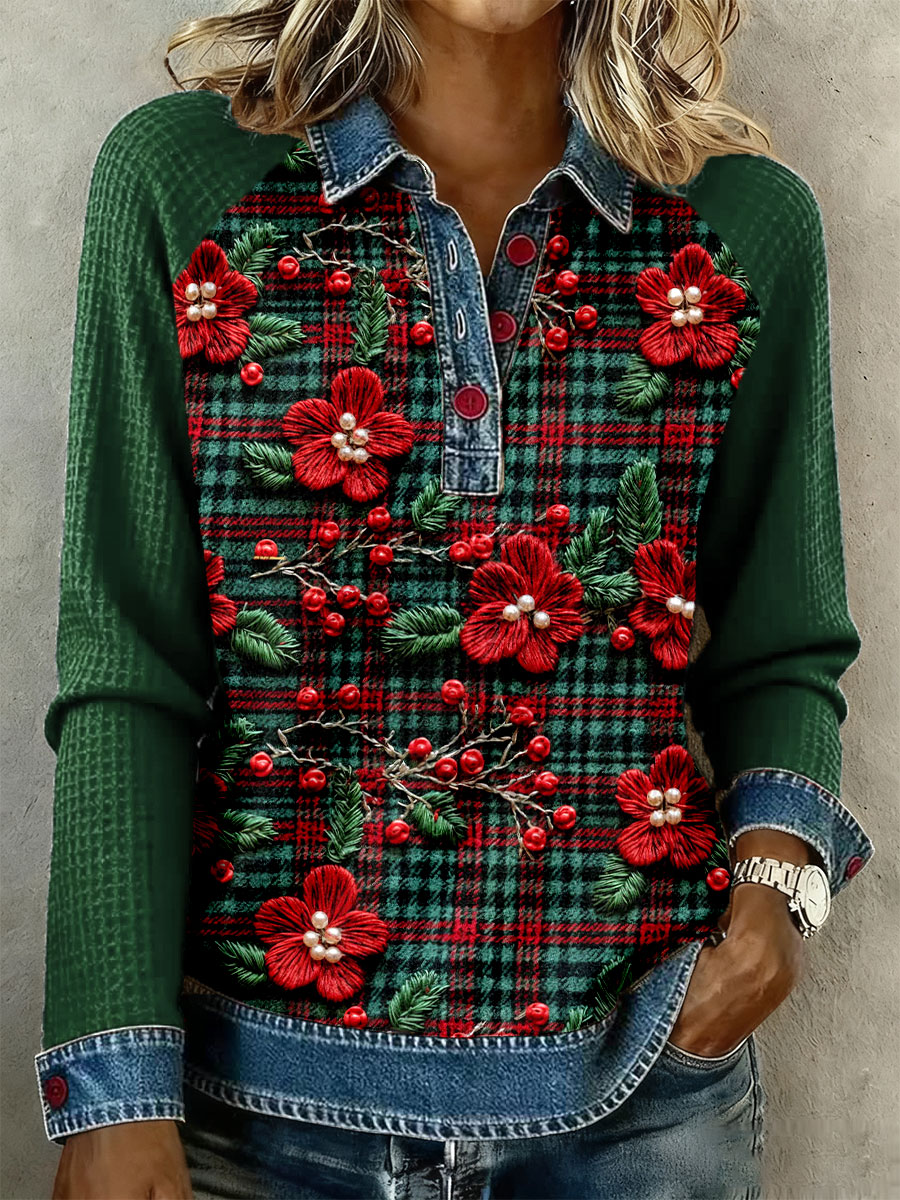 Women's Christmas Plaid Denim Collar Sweatshirt