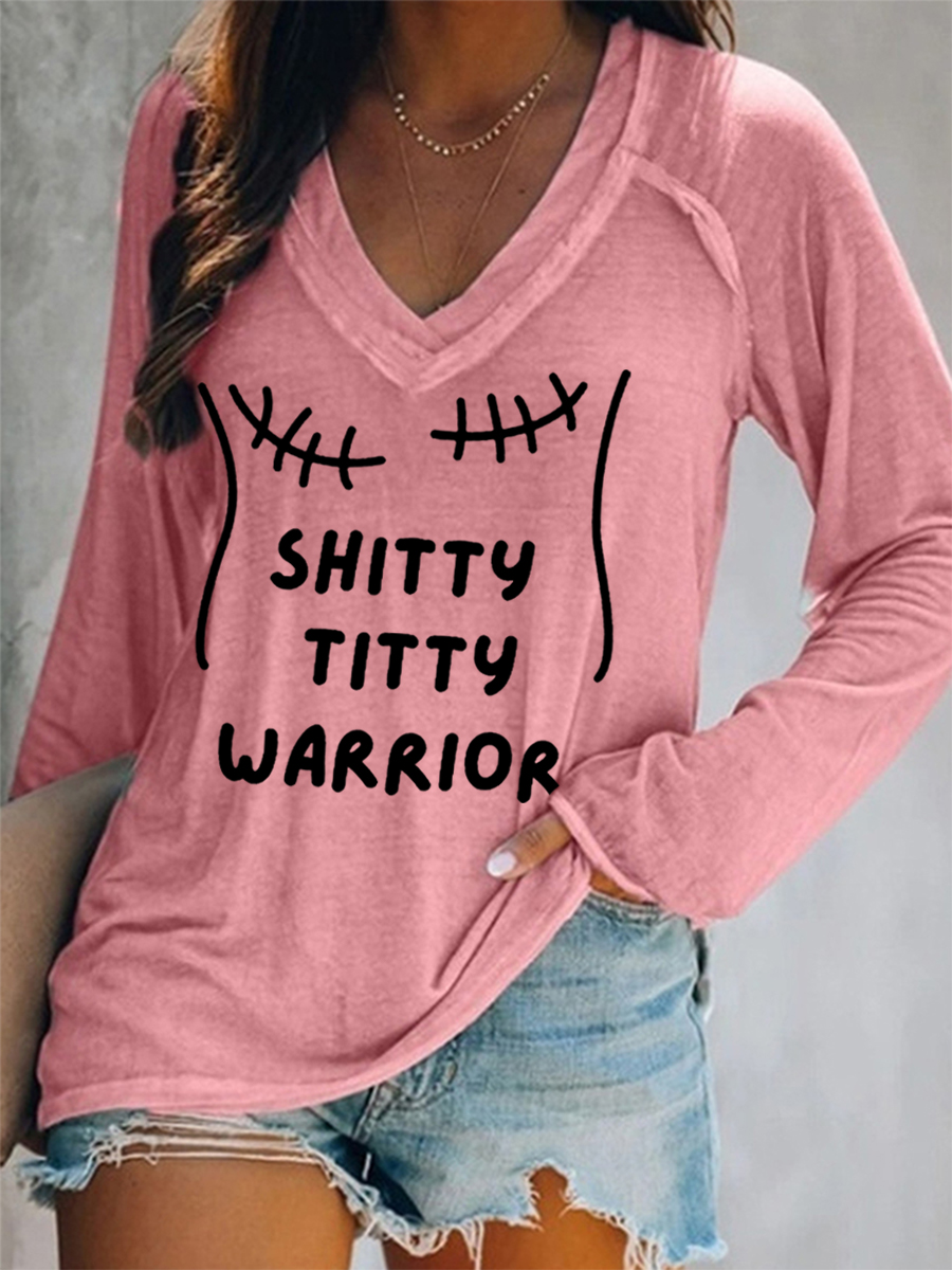 Women's Shitty Titty Warrior Breast Cancer Awareness Support V-Neck Long-Sleeve Top