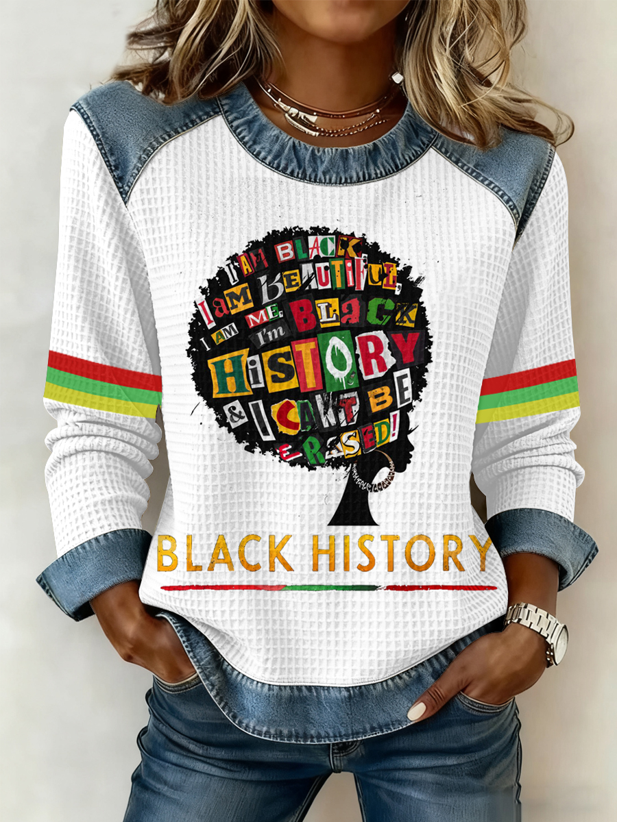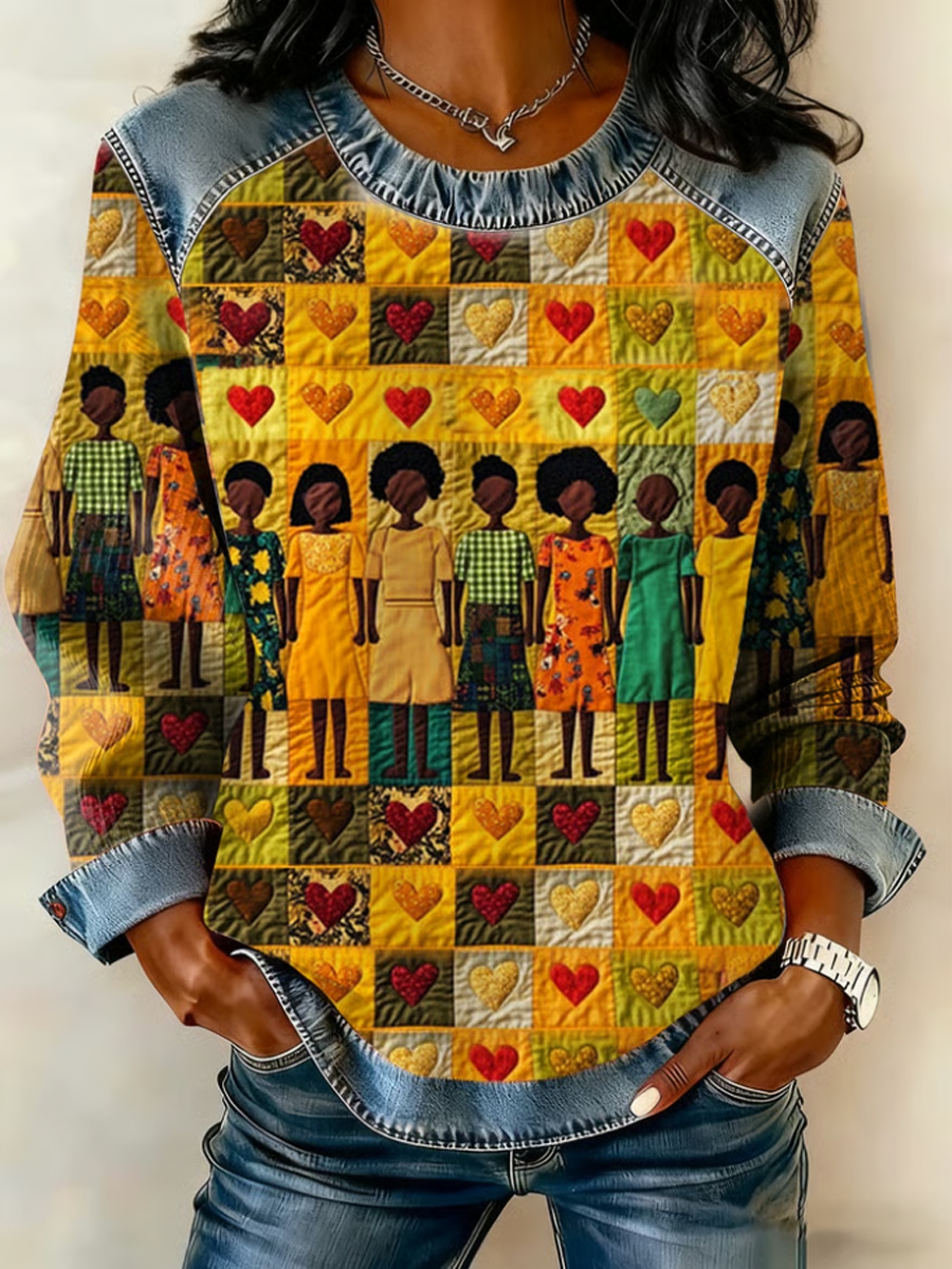 Women's Black Beauty Black History Month Print Denim Patchwork Top