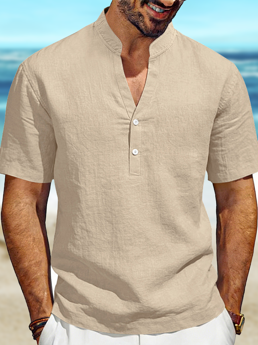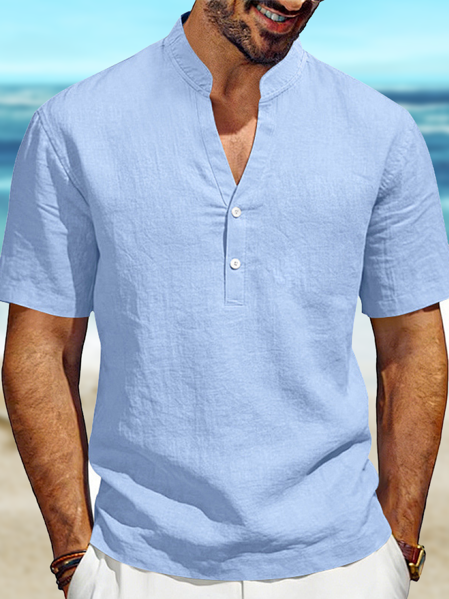 Men's Loose Casual Linen Commuter Breathable Henry V-Neck Short Sleeve Shirt