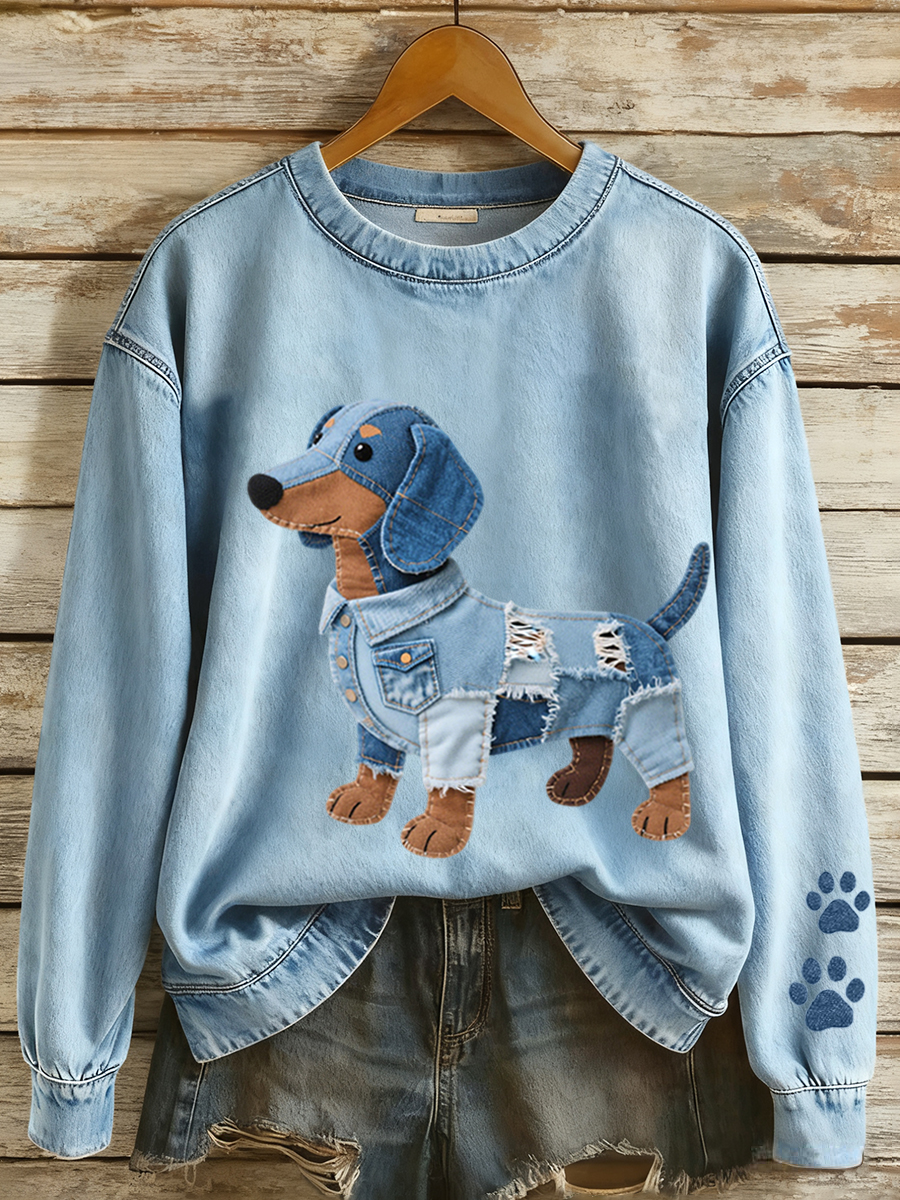 Women's Dachshund Pattern Denim Patchwork Art Sweatshirt