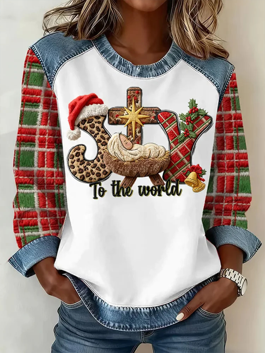 Women's Nativity Of Jesus Christmas Denim Patchwork Top
