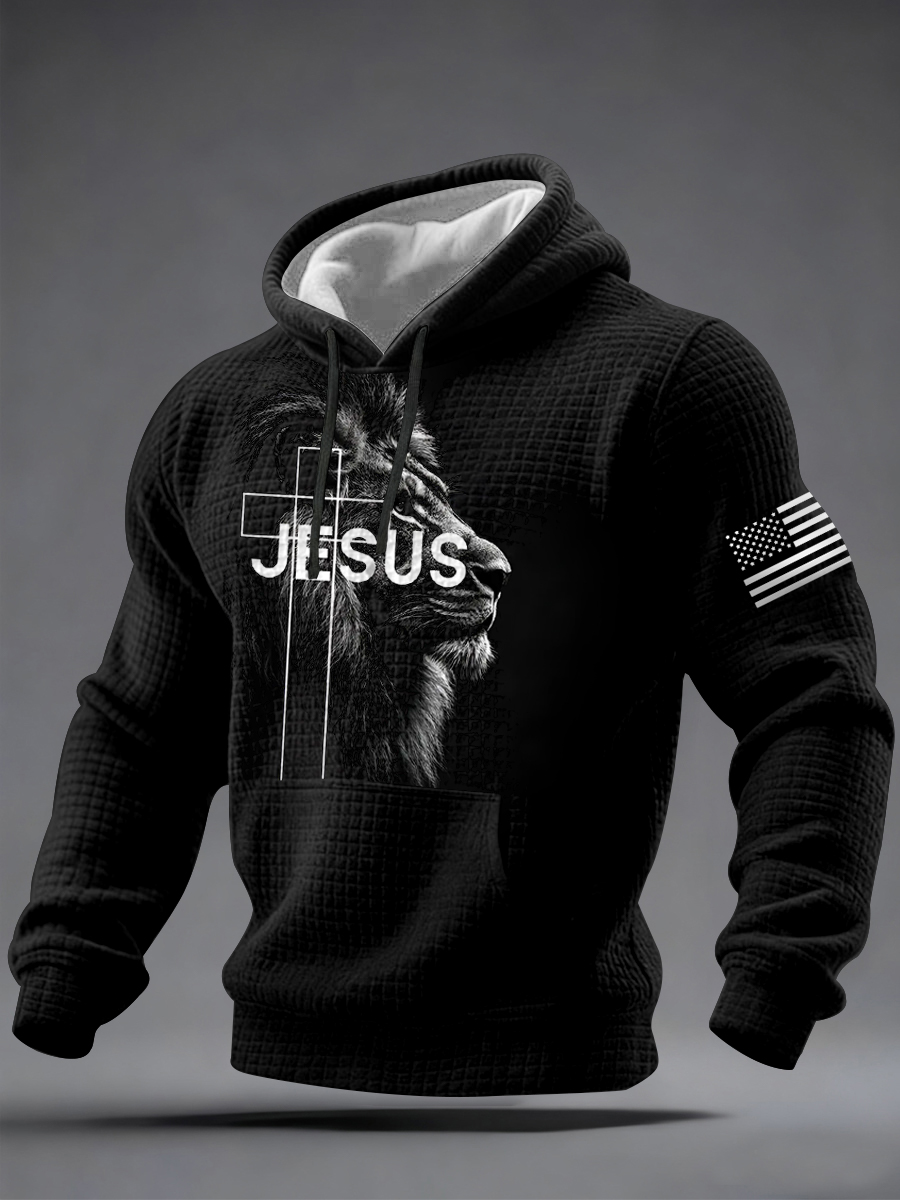 Men's Jesus Lion Print Casual Checkered Hoodie