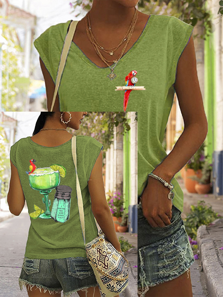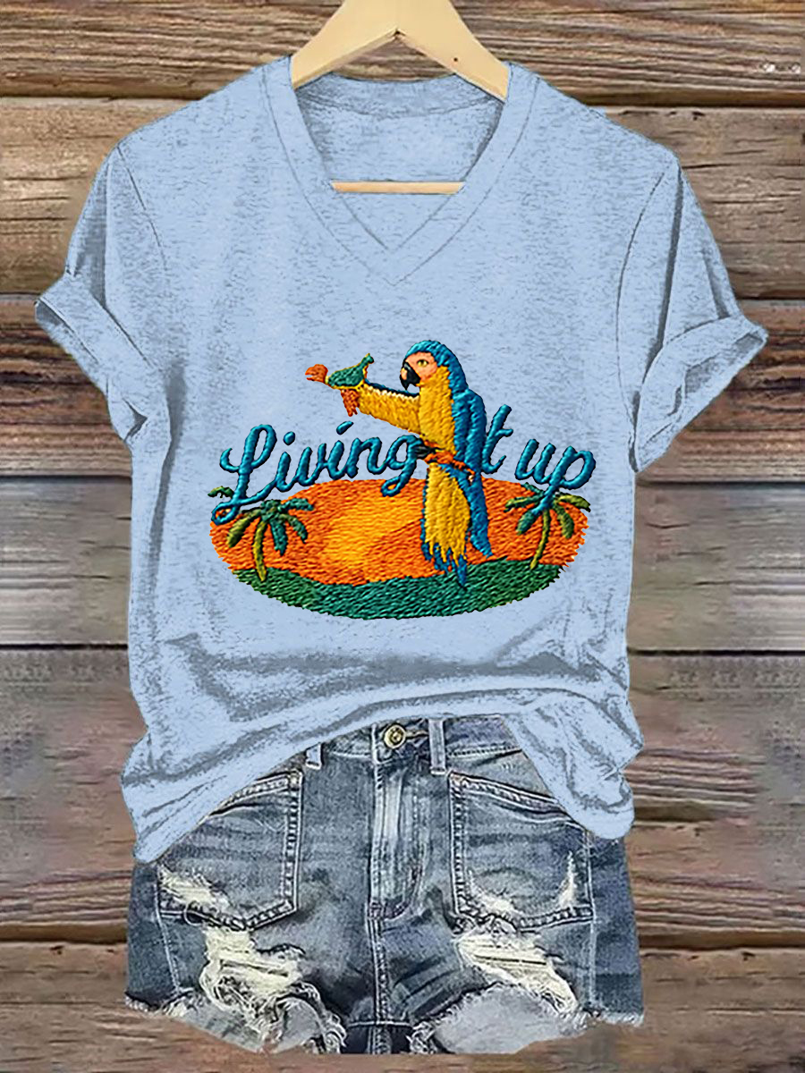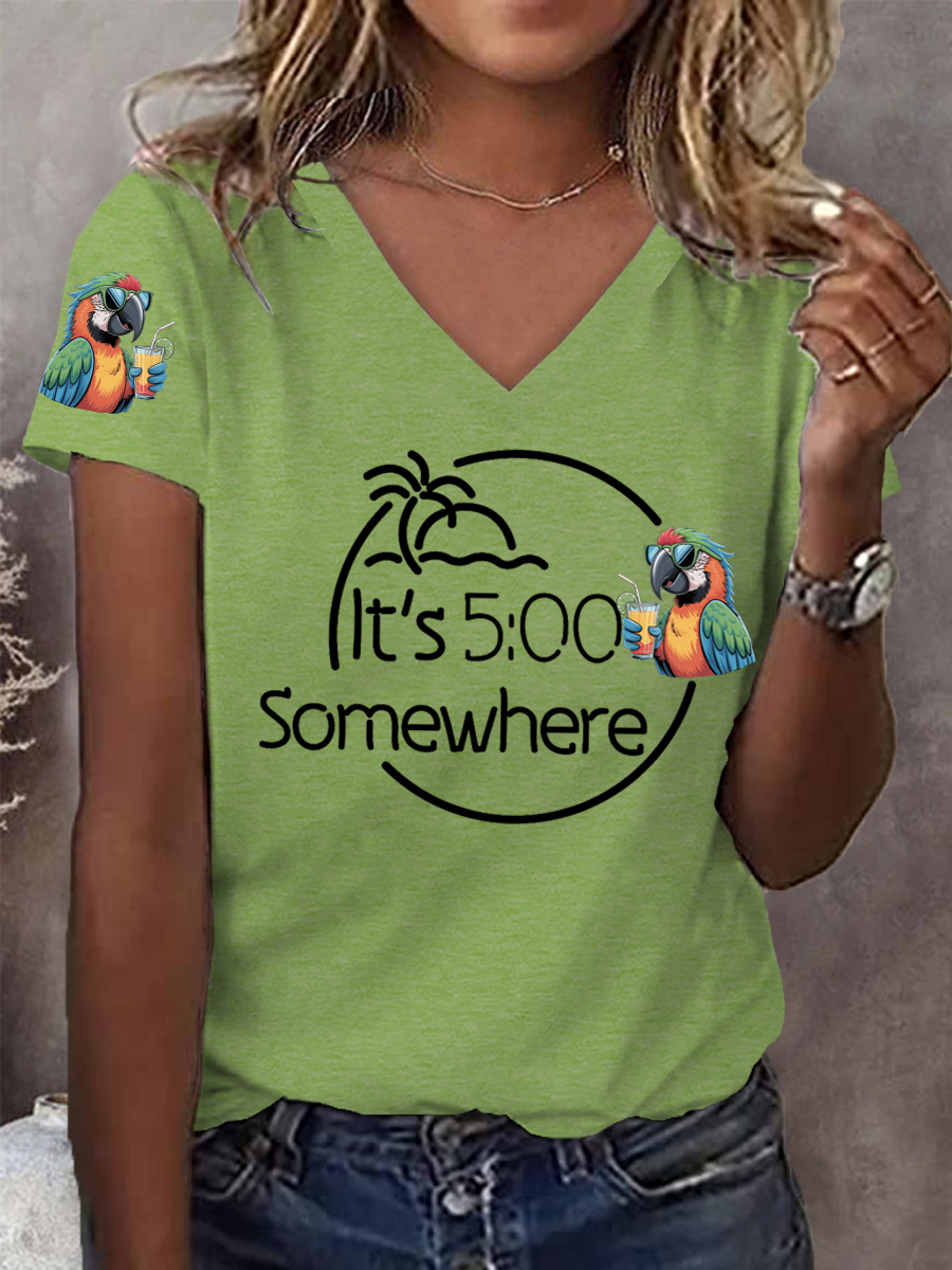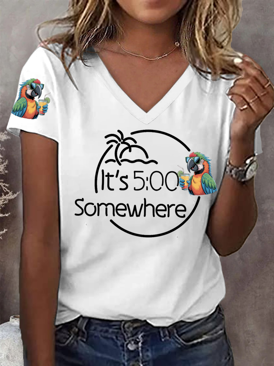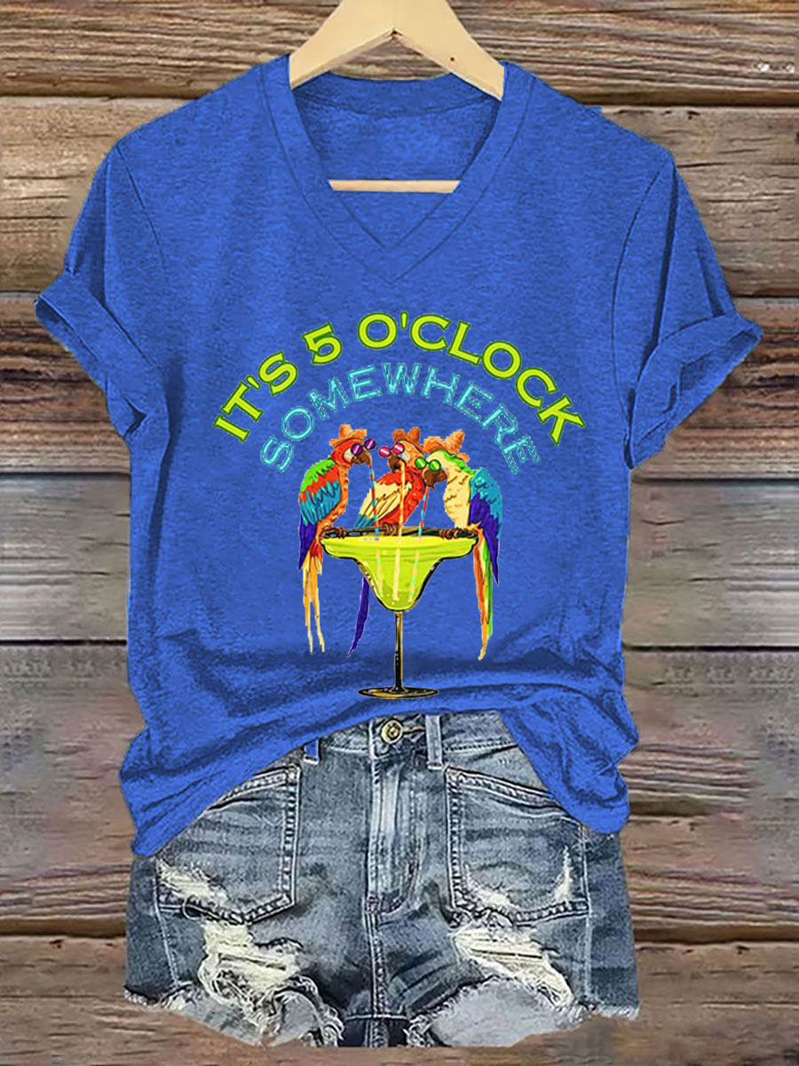 Women's It‘s 5 O'clock Somewhere Parrot Print Casual V-Neck Tee