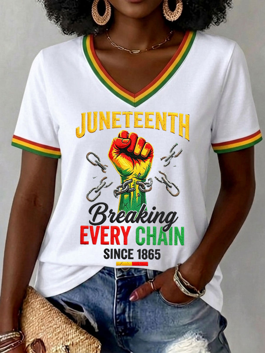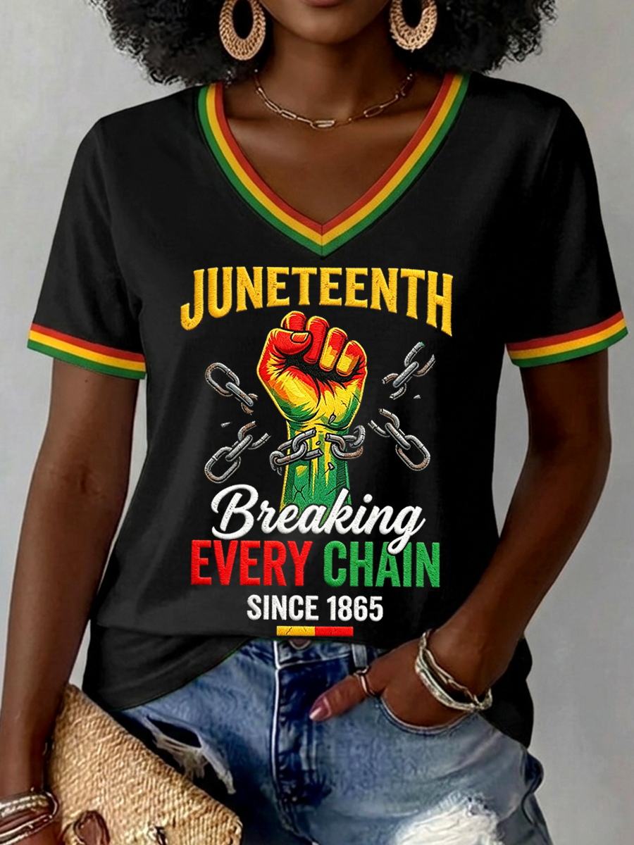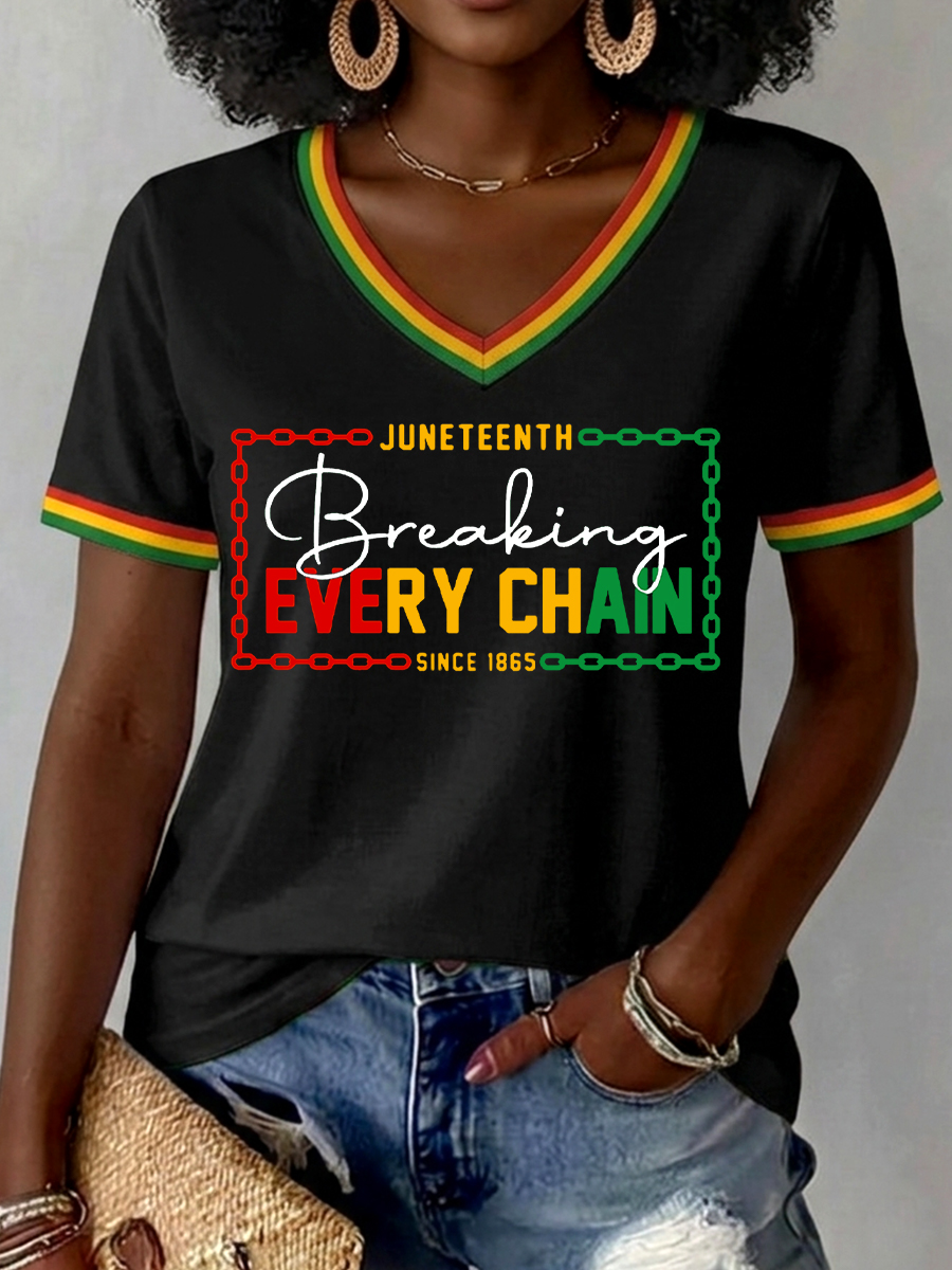 Women's Juneteenth Breaking Every Chain Since 1865 Print Casual V-Neck Tee