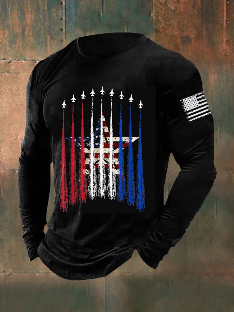 Men's Fighter Jets Red White Blue Long Sleeve Round Neck T-shirt