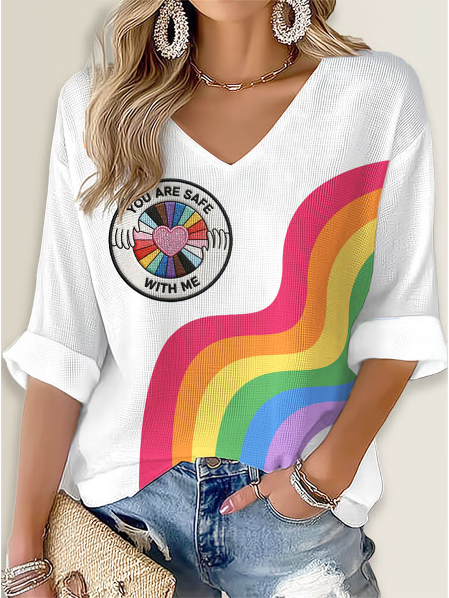 Women‘s Rainbow You Are Safe With Me Printed Long Sleeve Waffle T-shirt