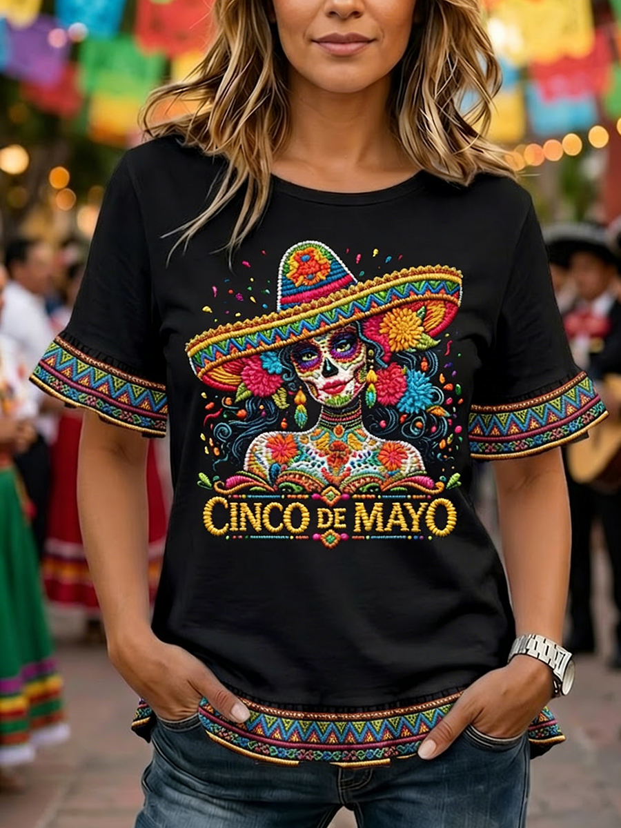Women's Cinco De Mayo Print Casual Ruffle Sleeve Tee