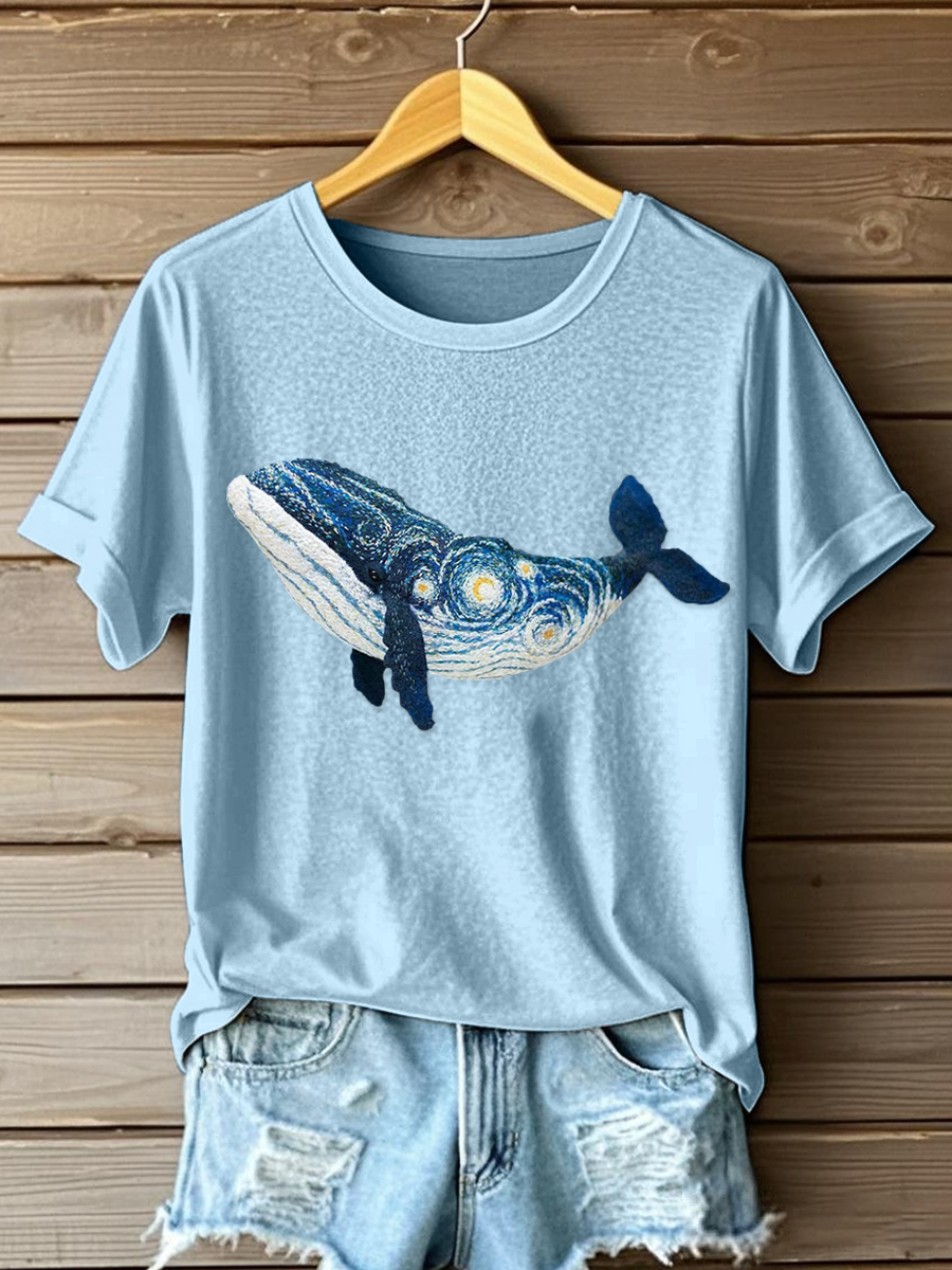 Women's Blue Whale Embroidery Pattern T-Shirt