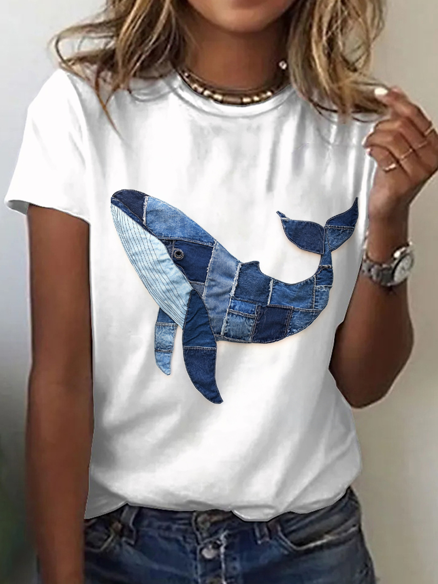 Women's Whale Pattern Patchwork Art T-Shirt