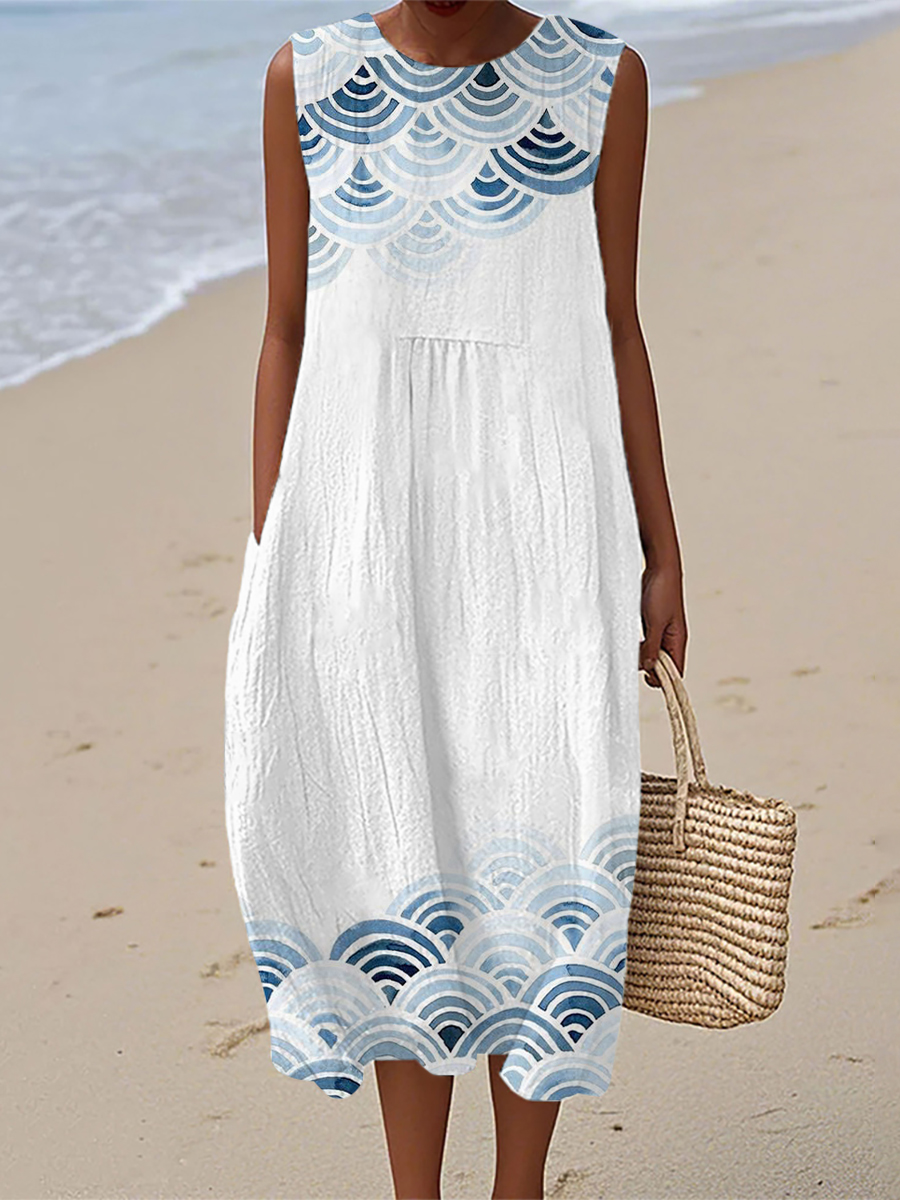 Women's Ocean Wave Inspired Print Linen Dress