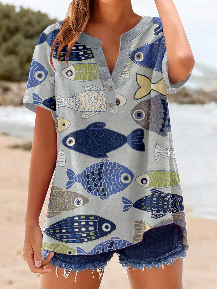 Women's Vintage Fish Art Print Linen Shirt
