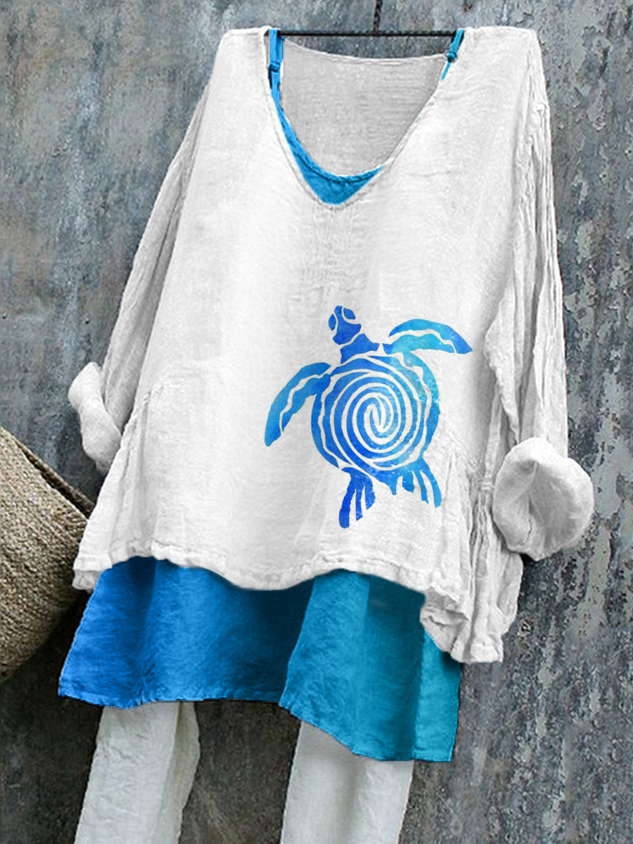 Women's Sea Turtle Art Print Linen Shirt
