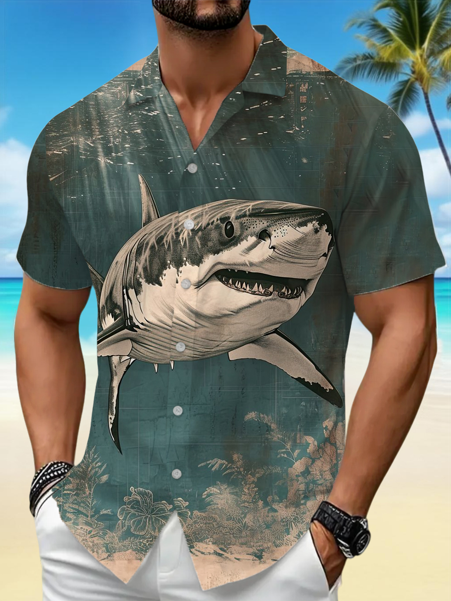 Men's Vintage Shark Print Casual Short-Sleeve Vacation Shirt