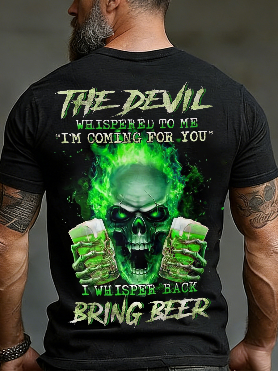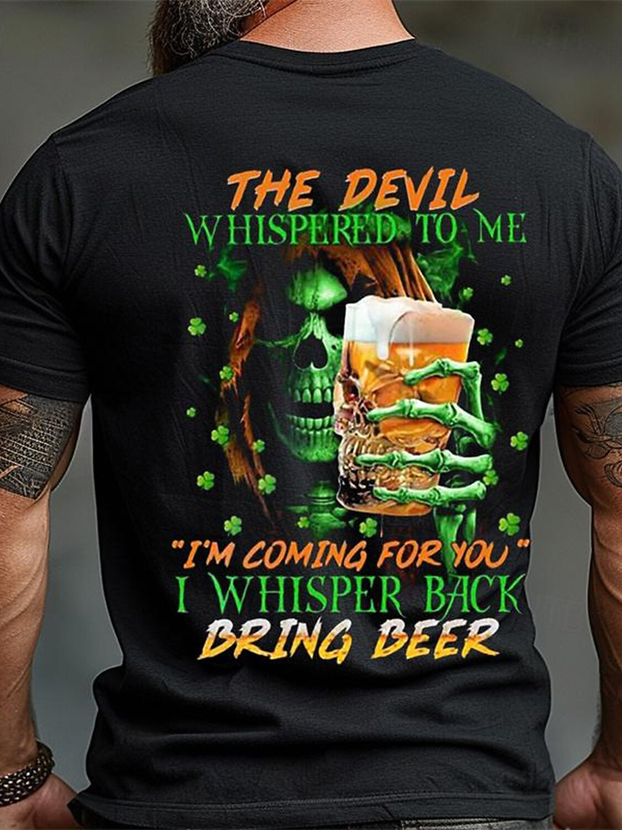 Men's Funny St. Patrick's Day The Devil Whispered to Me I'm Coming for You I Whisper Back Bring Beer Skull Print Casual Tee