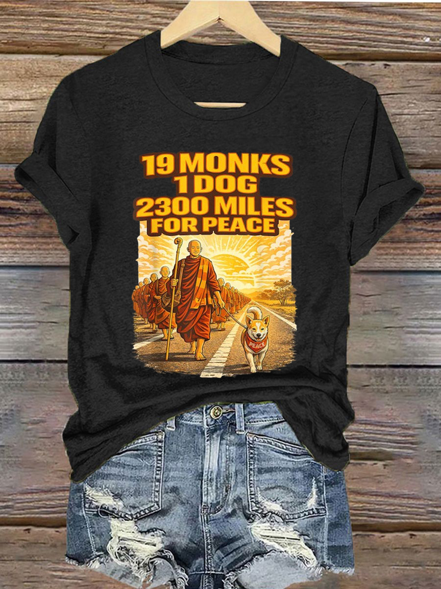 Women's Walk For Peace Monks With Aloka Dog Printed T-shirt