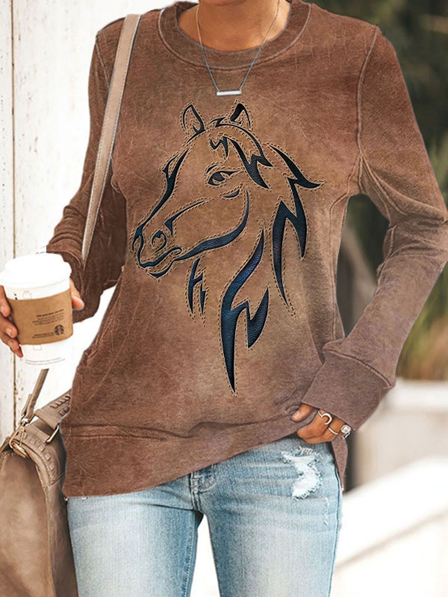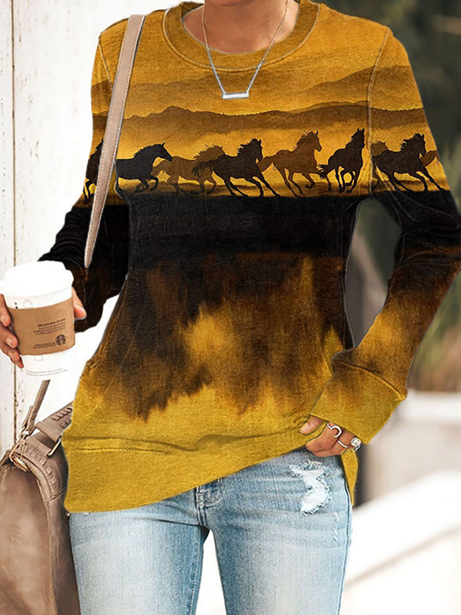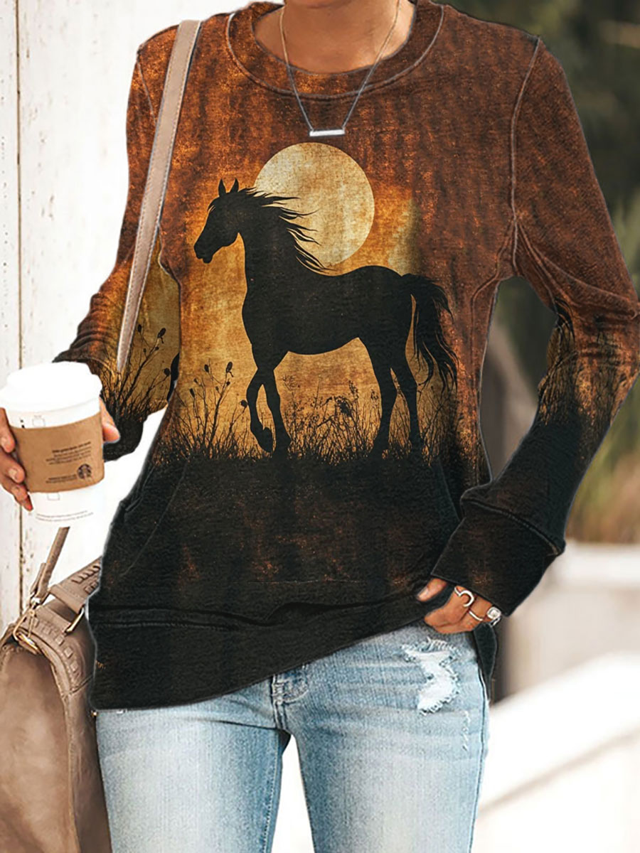 Women's Retro Western Horse Print Casual Sweatshirt