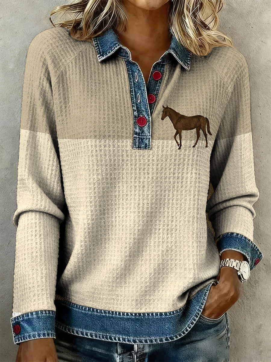 Women's Horse Print Denim Patchwork Top