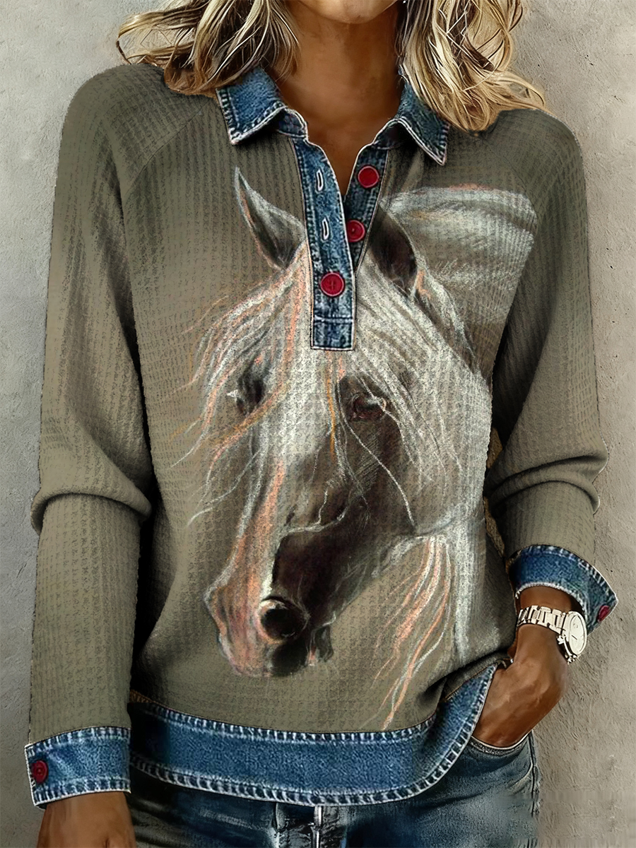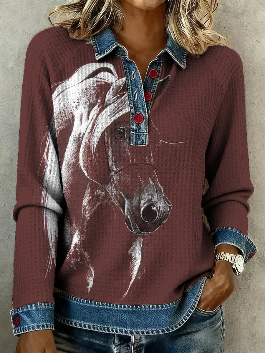 Women's Retro Horse Art Print Denim Patchwork Top
