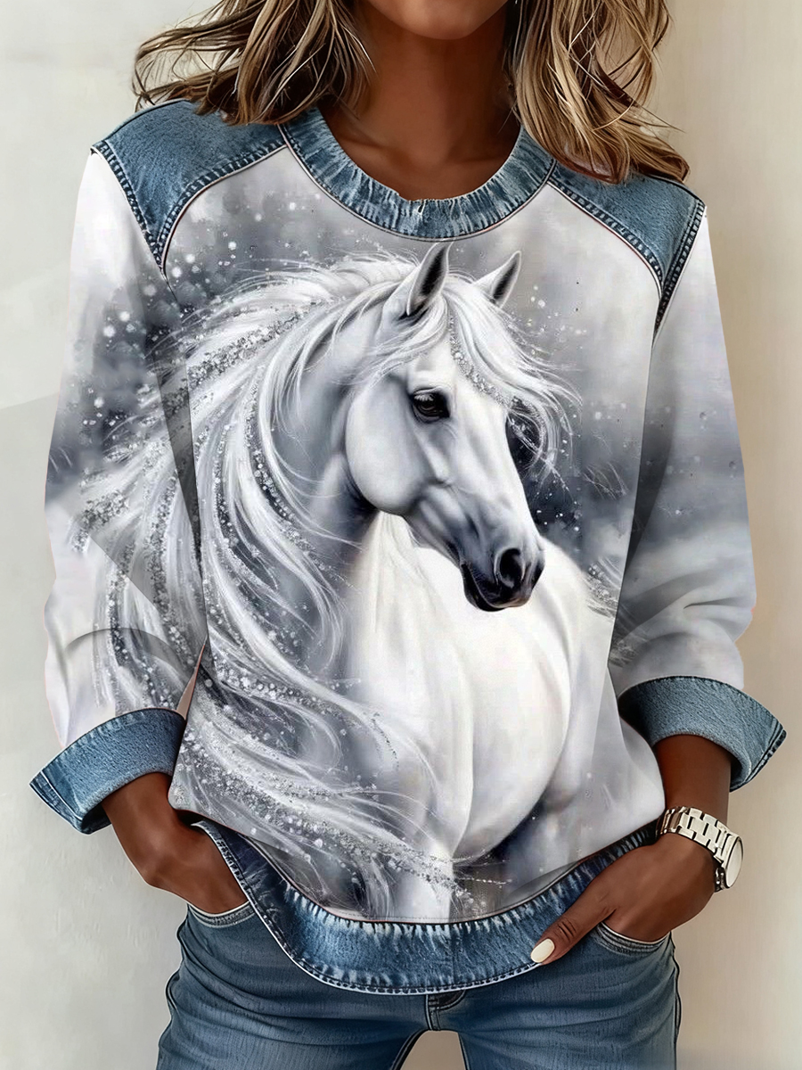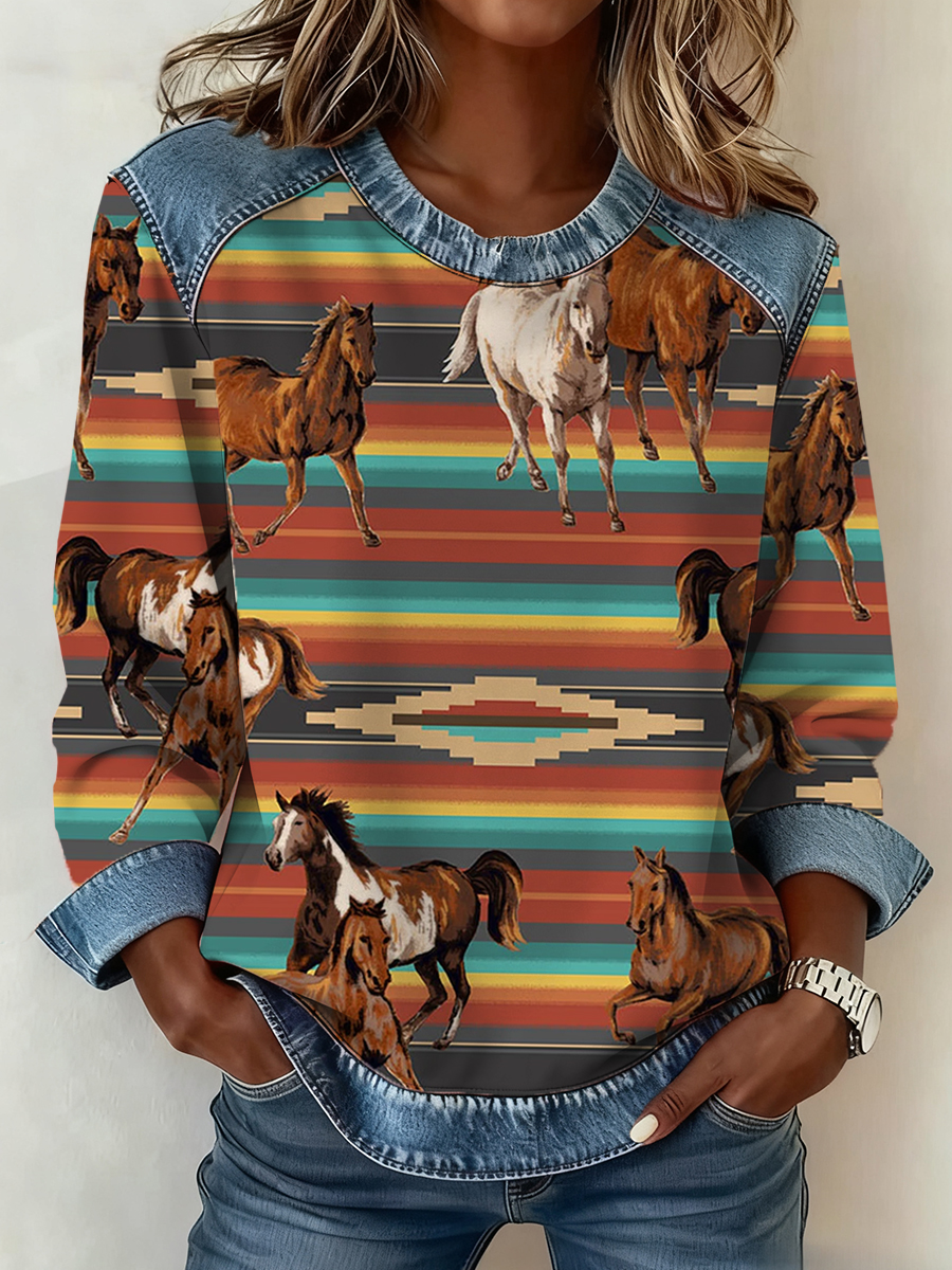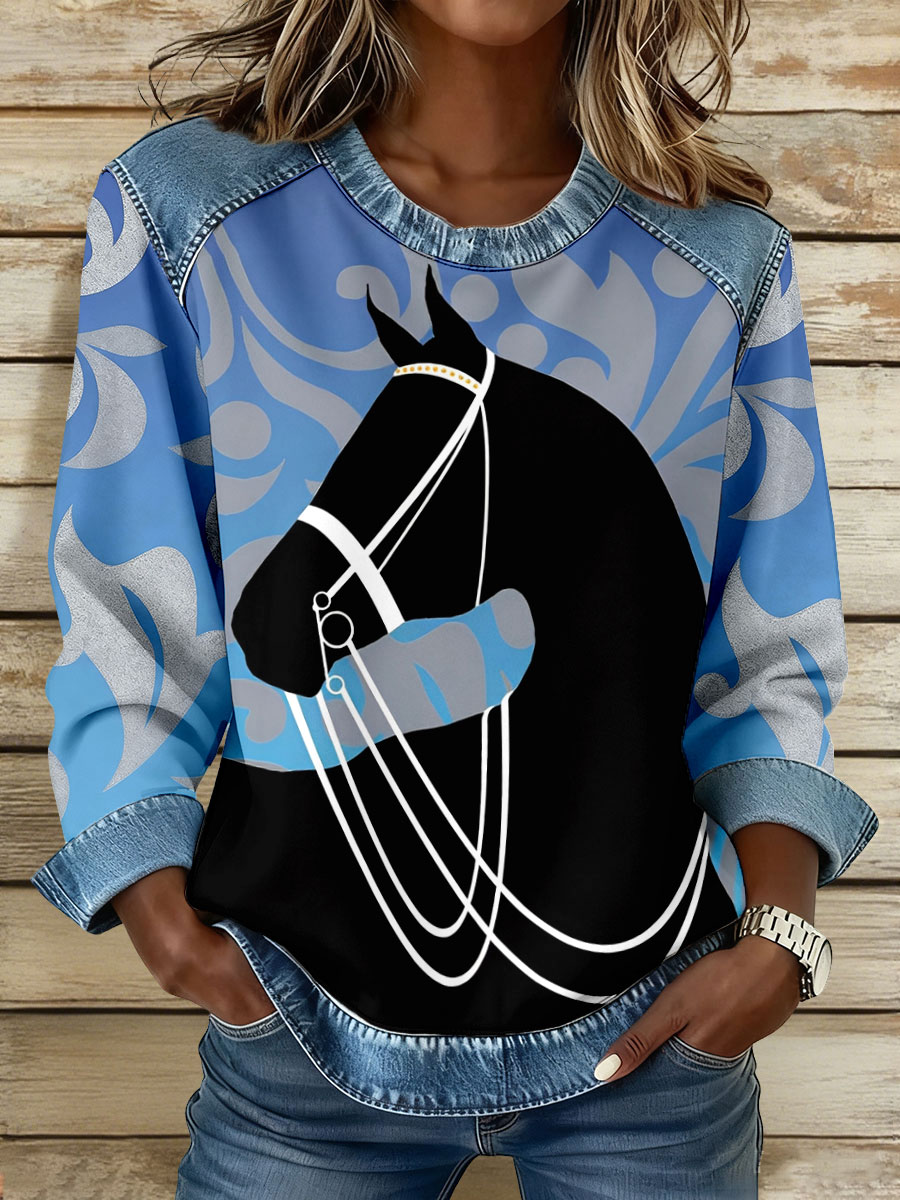 Women's Western Horse Art Print Denim Patchwork Sweatshirt
