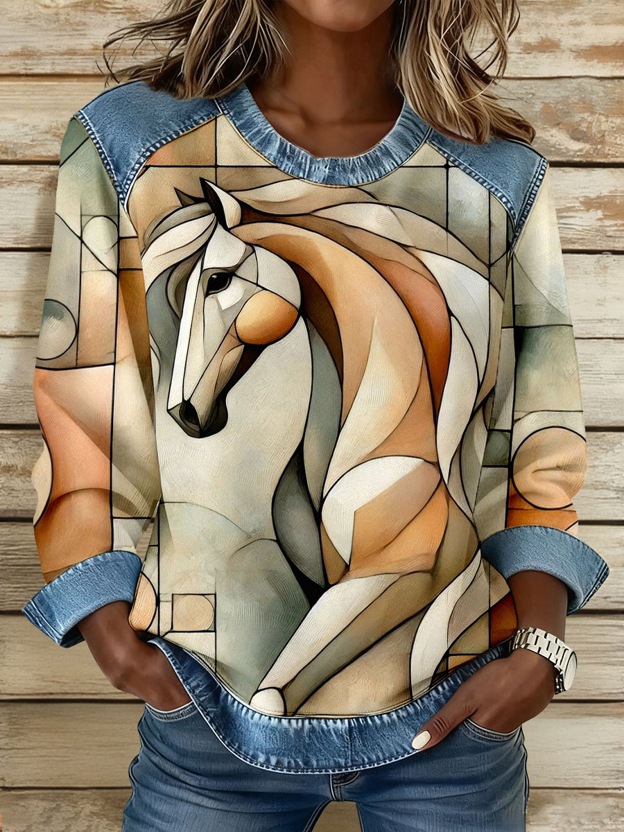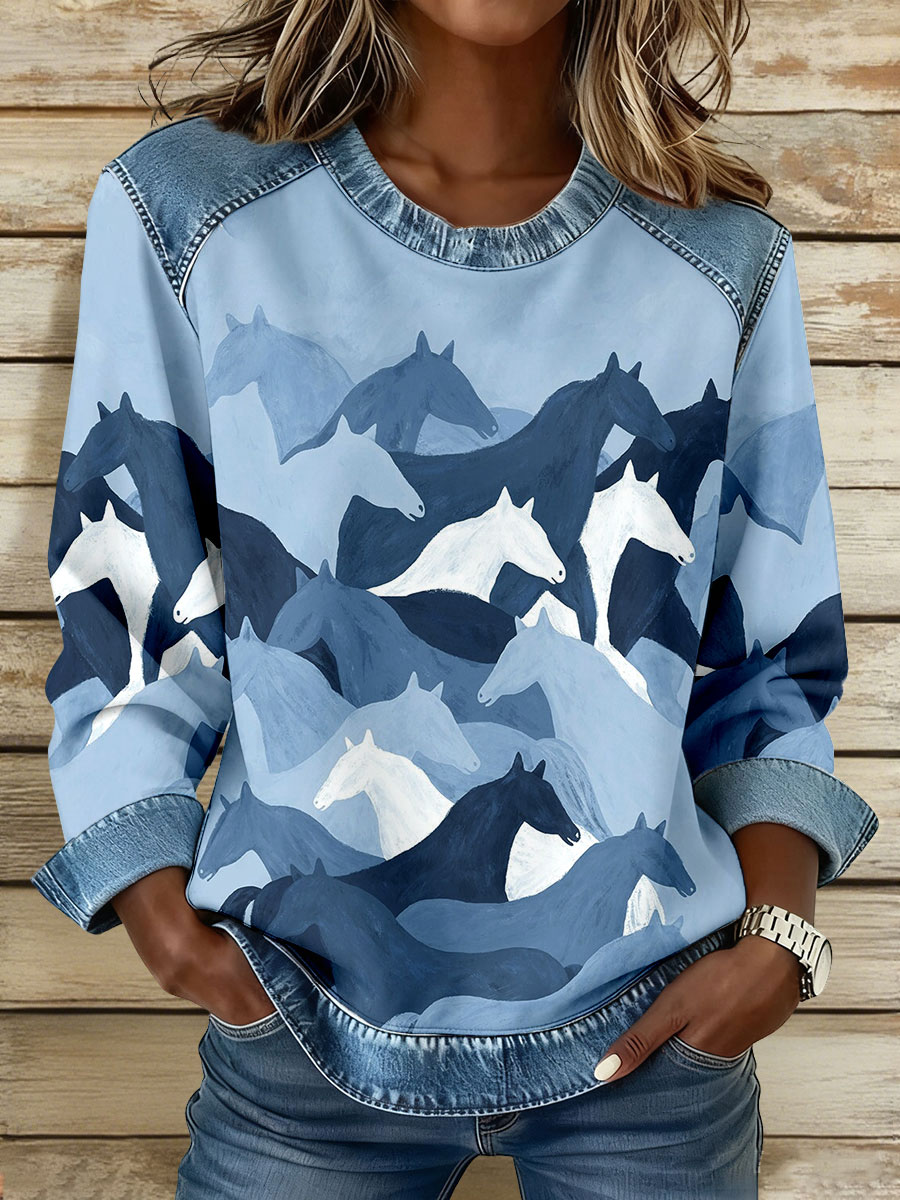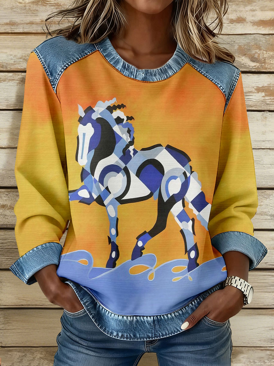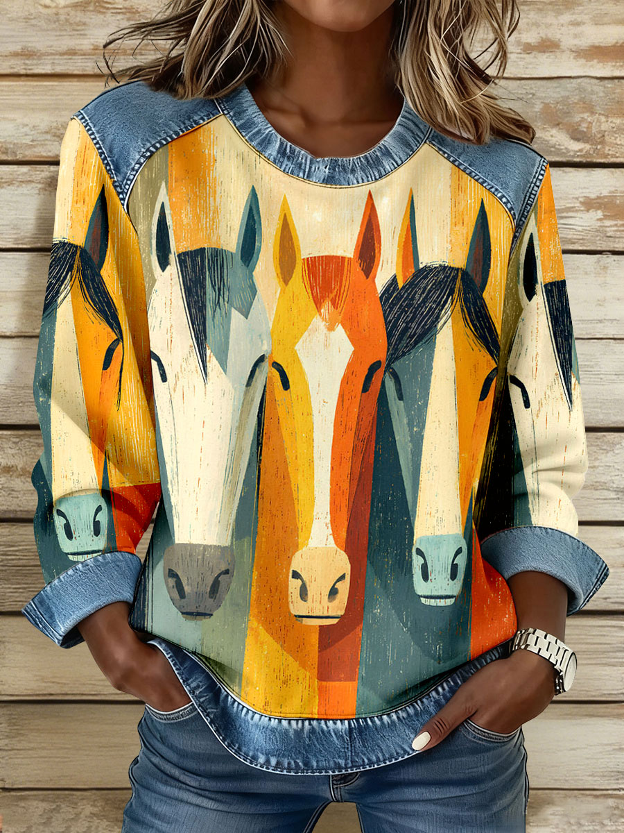 Women's Vintage Horse Art Print Denim Patchwork Sweatshirt