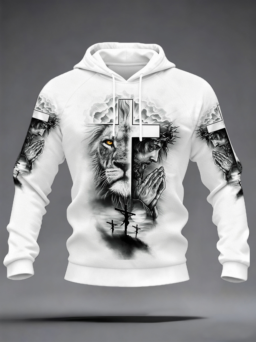 Men's Christian Jesus And Lion Cross Print Velvet Raglan Hoodie