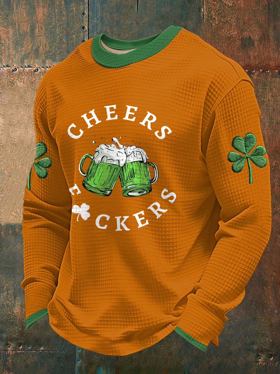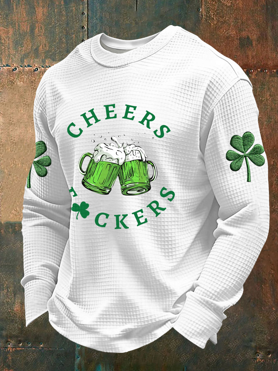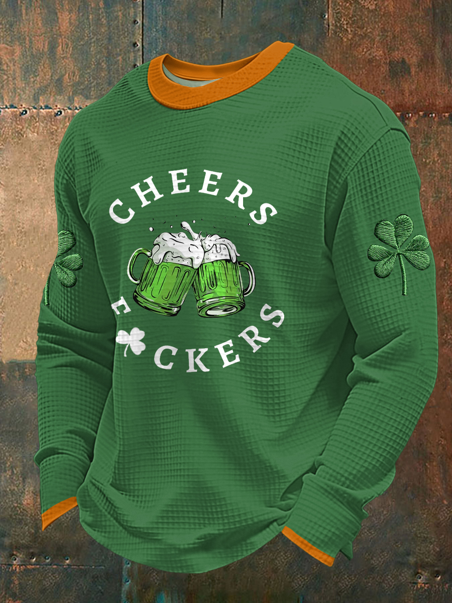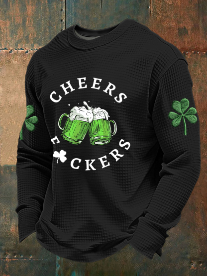 Men's Funny St Patrick's Day Cheers F*ckers Green Beer Shamrock Print Waffle Long Sleeve T-Shirt