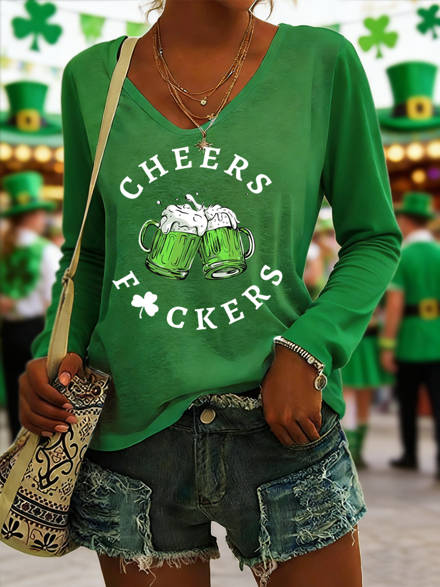 Men's Funny St. Patrick's Day Cheers F*ckers Green Beer Shamrock Print Casual V-Neck Long-Sleeve T-Shirt