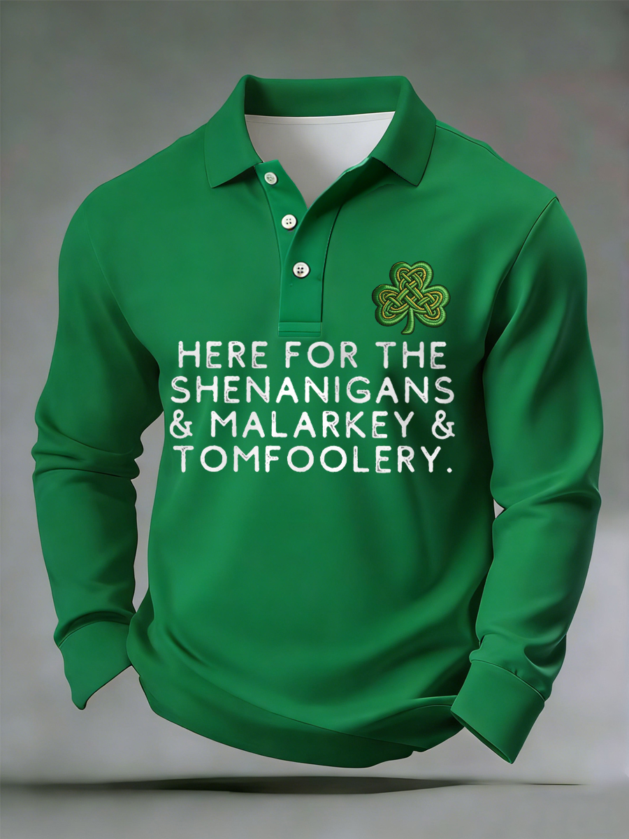Men's Funny St. Patrick's Day Here For The Shenanigans Malarkey Tomfoolery Shamrock Print Casual Long-Sleeve Top