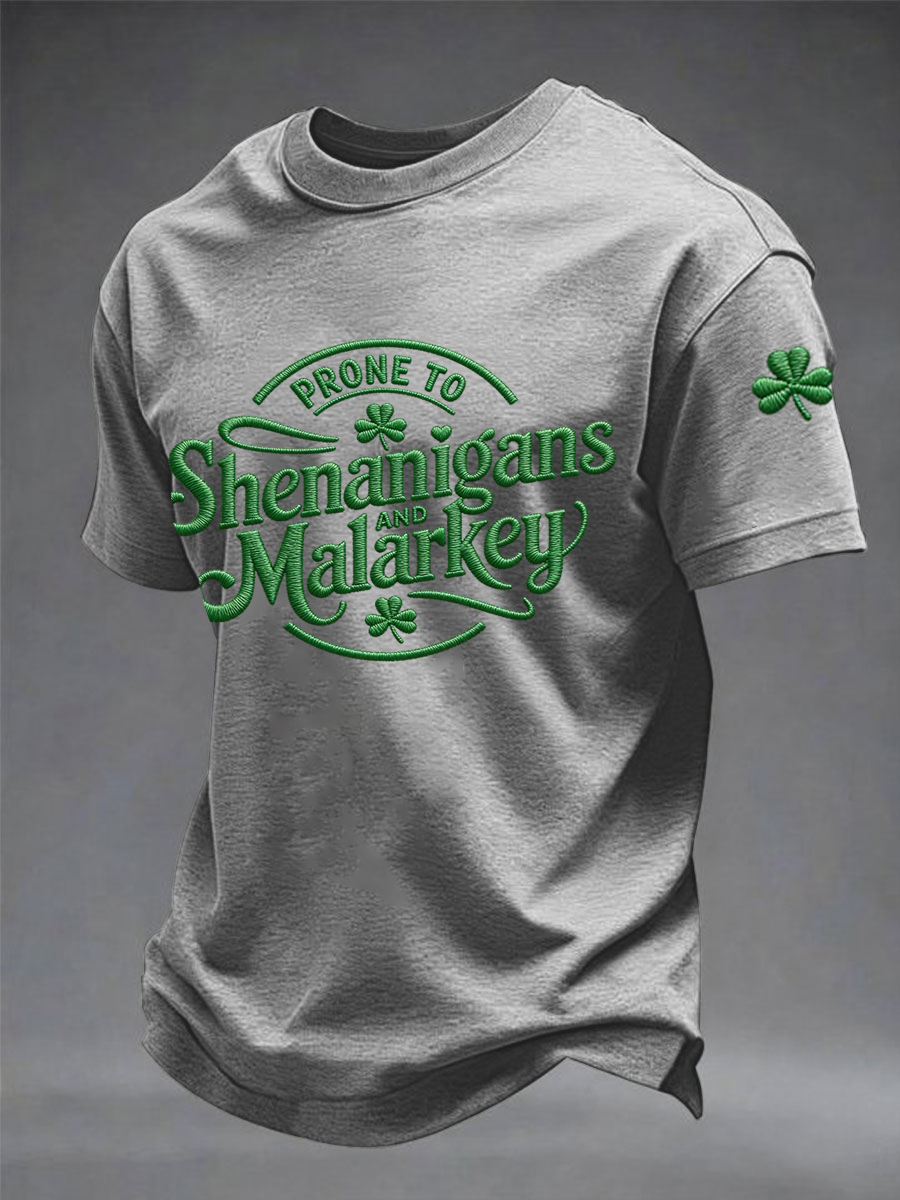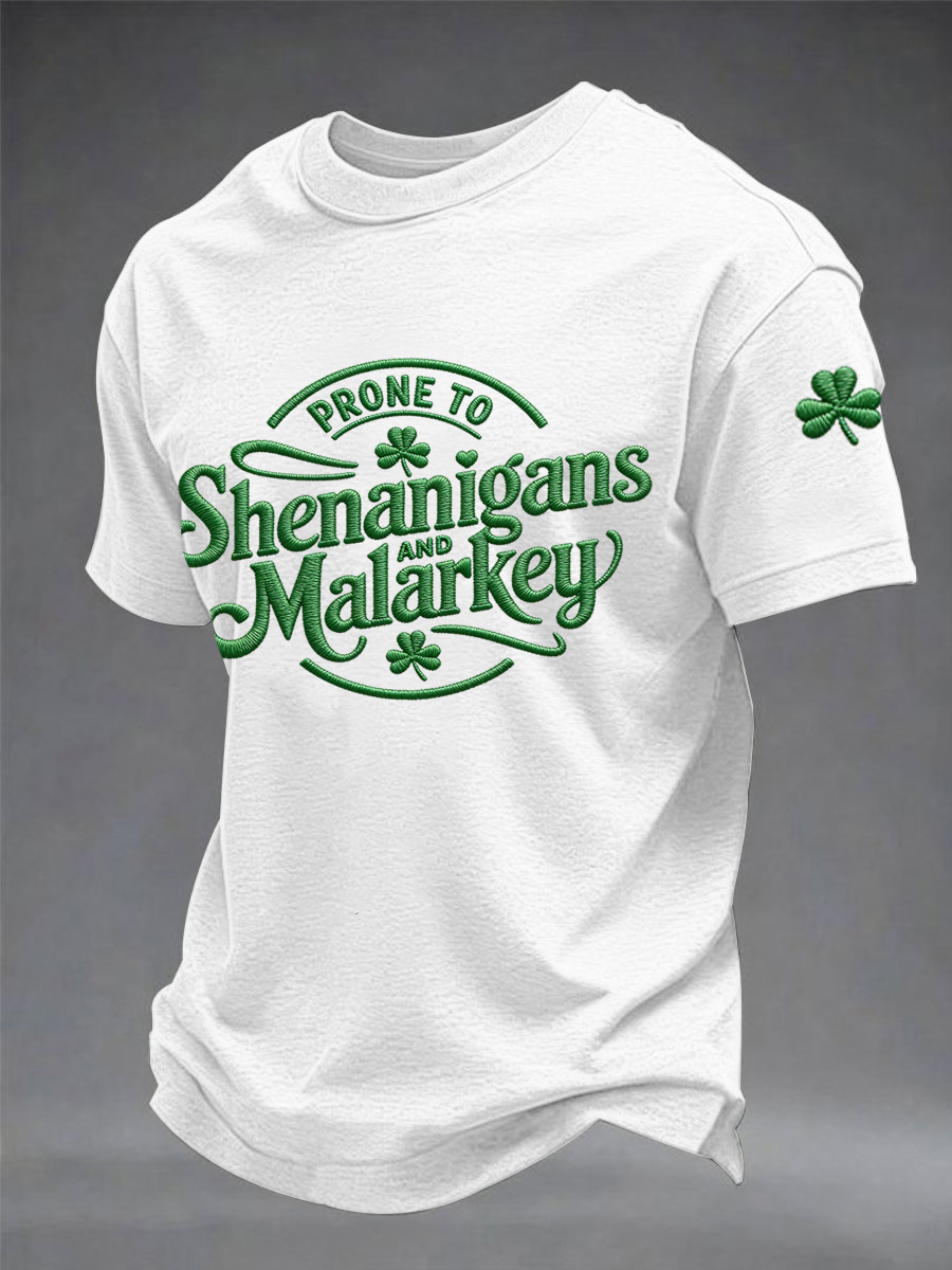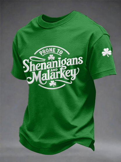 Men's Funny St. Patrick's Day Prone To Shenanigans And Malarkey Shamrock Print Casual Tee