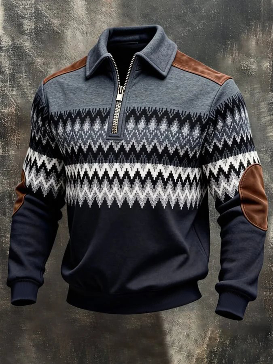 Men's Retro Color Block Print Zip-Up Sweatshirt