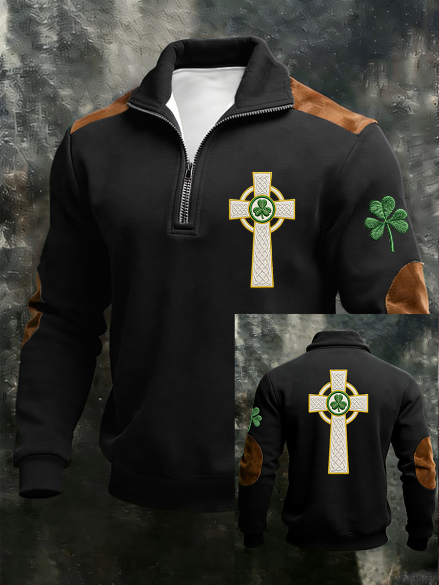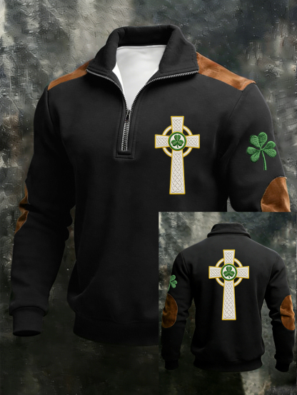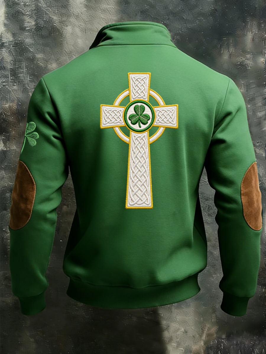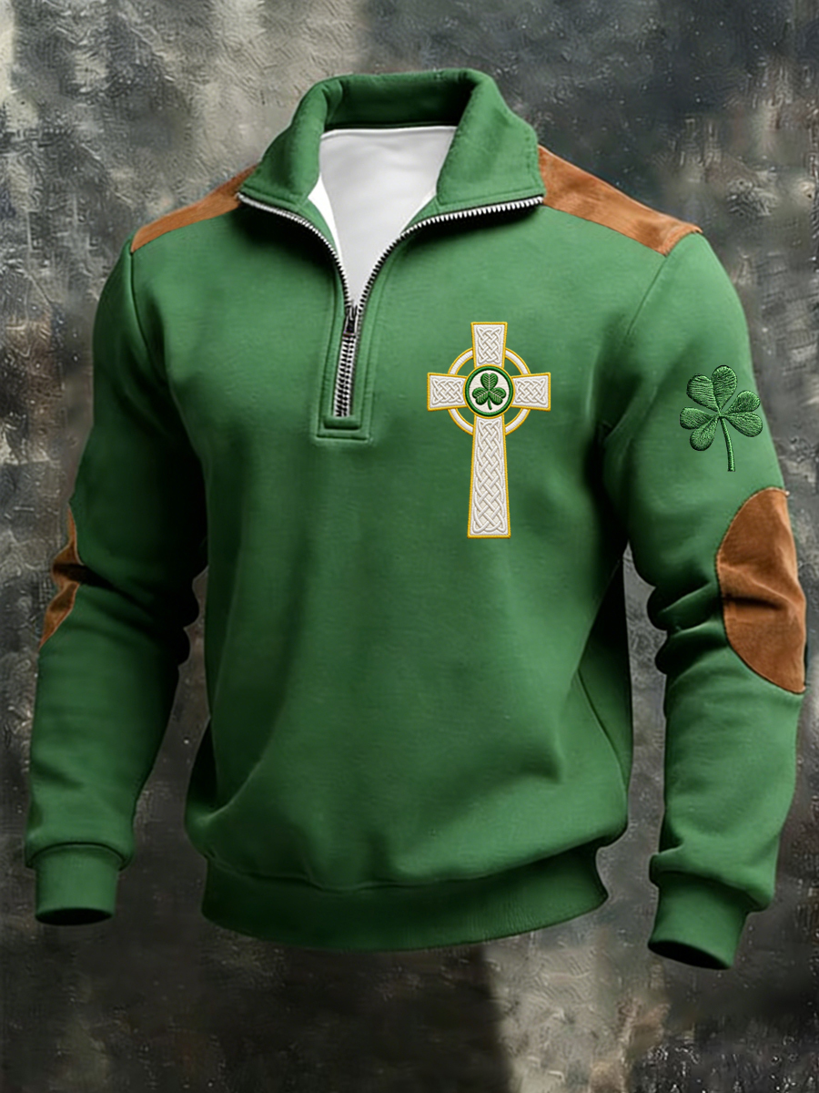 Men's St Patrick's Day Shamrock Celtic Knot Cross Print Casual Zipper Pullover