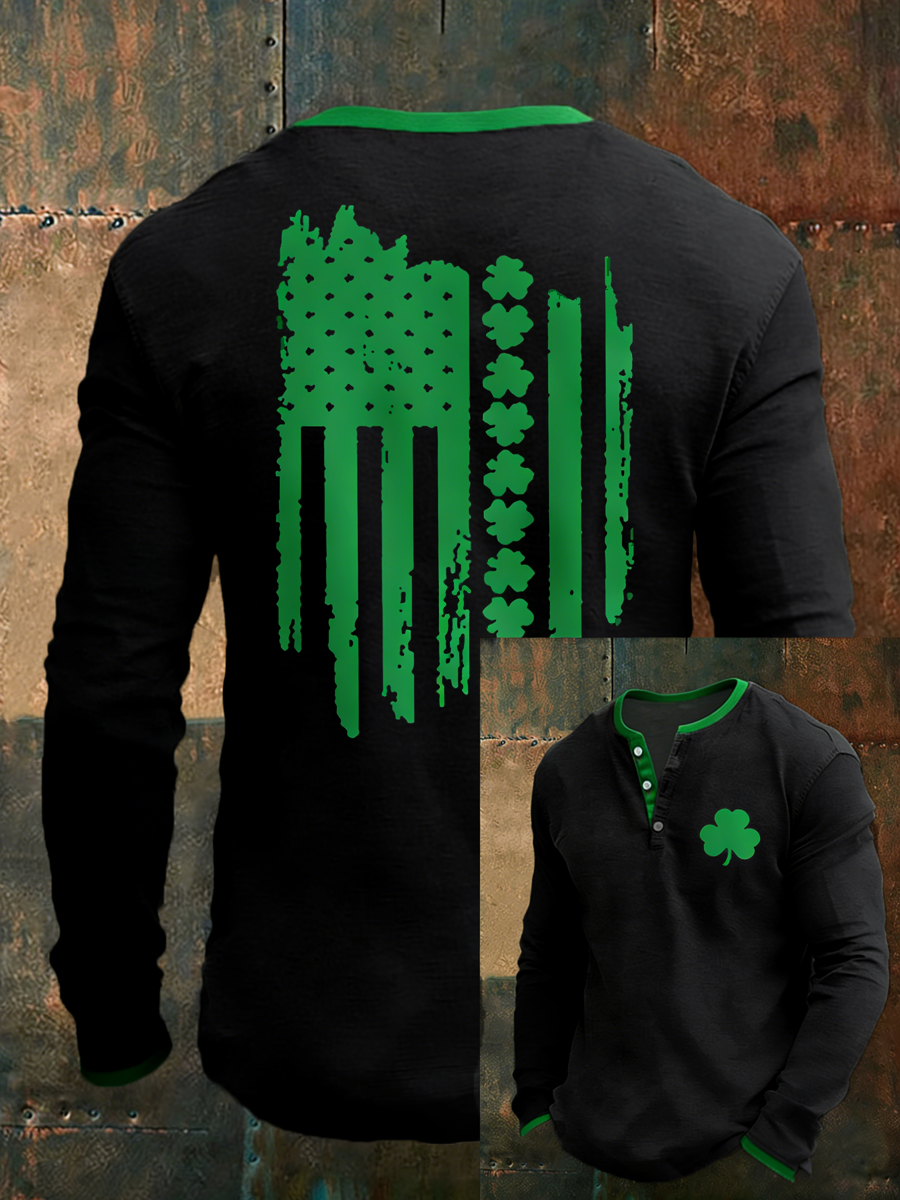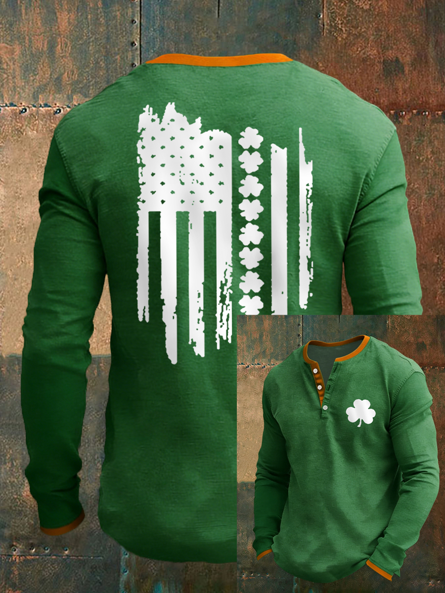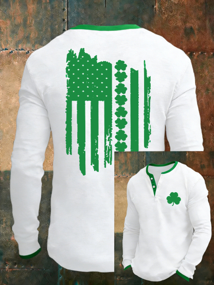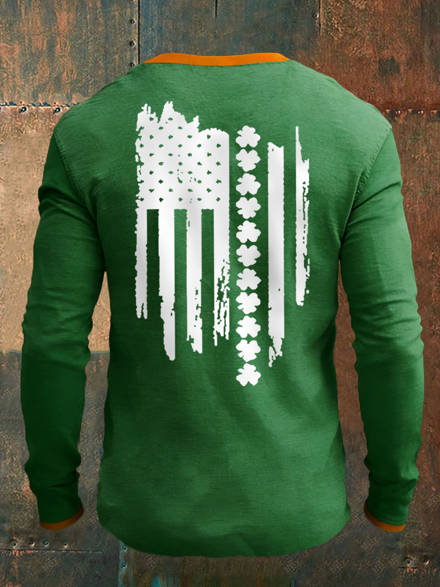Men's St Patrick's Day Shamrocks USA Flag Print Casual Long Sleeve T-Shirt