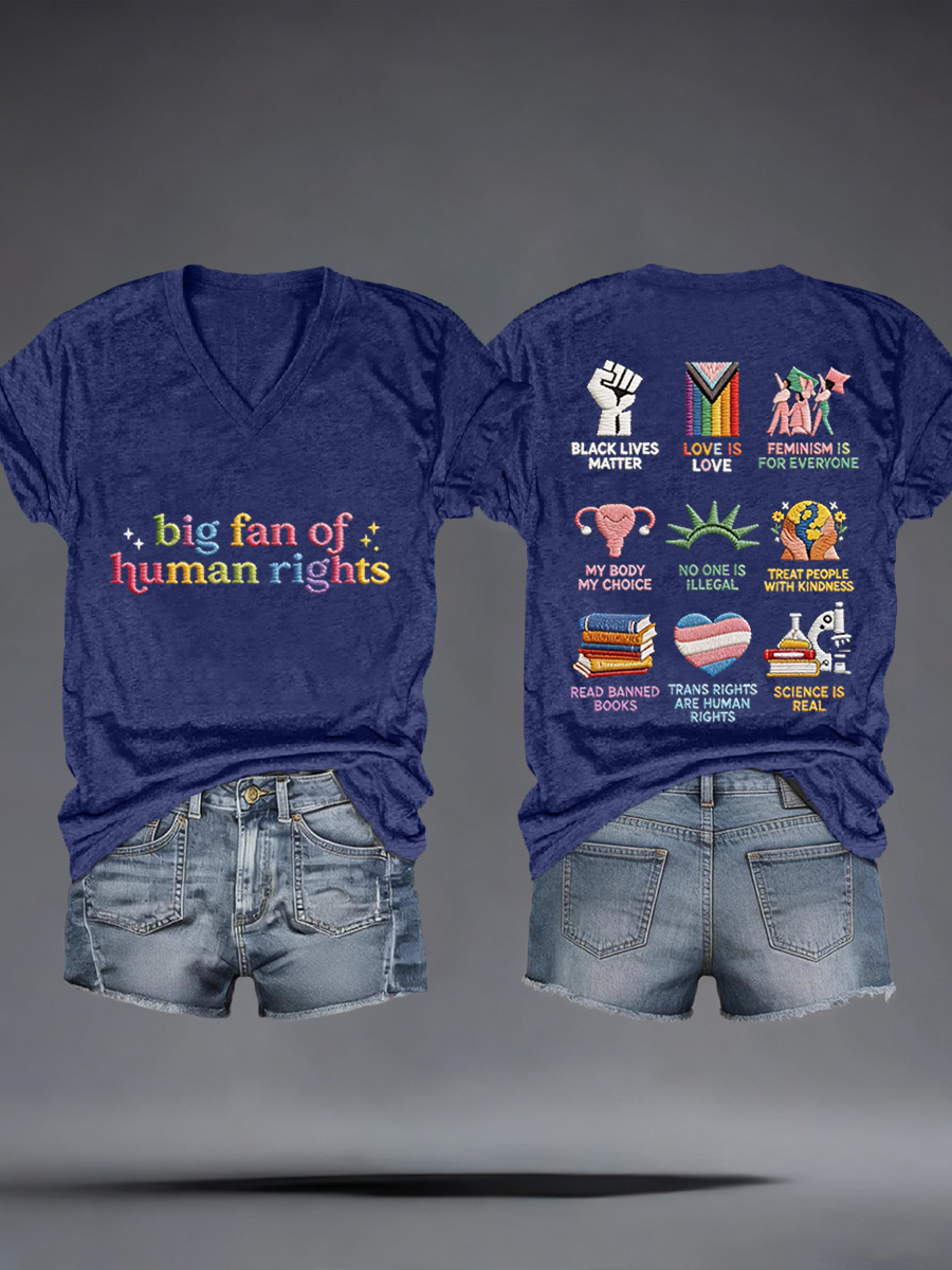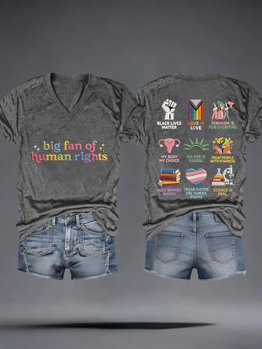 Women's Big Fan of Human Rights Embroidery Pattern V-Neck T-Shirt