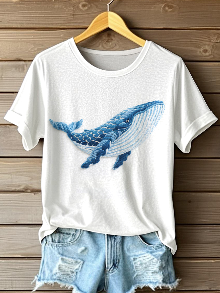 Women's Blue Whale Embroidery Pattern T-Shirt