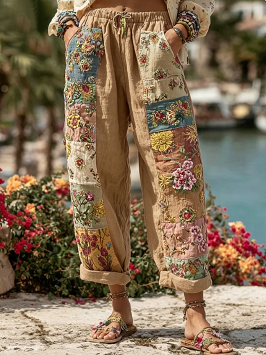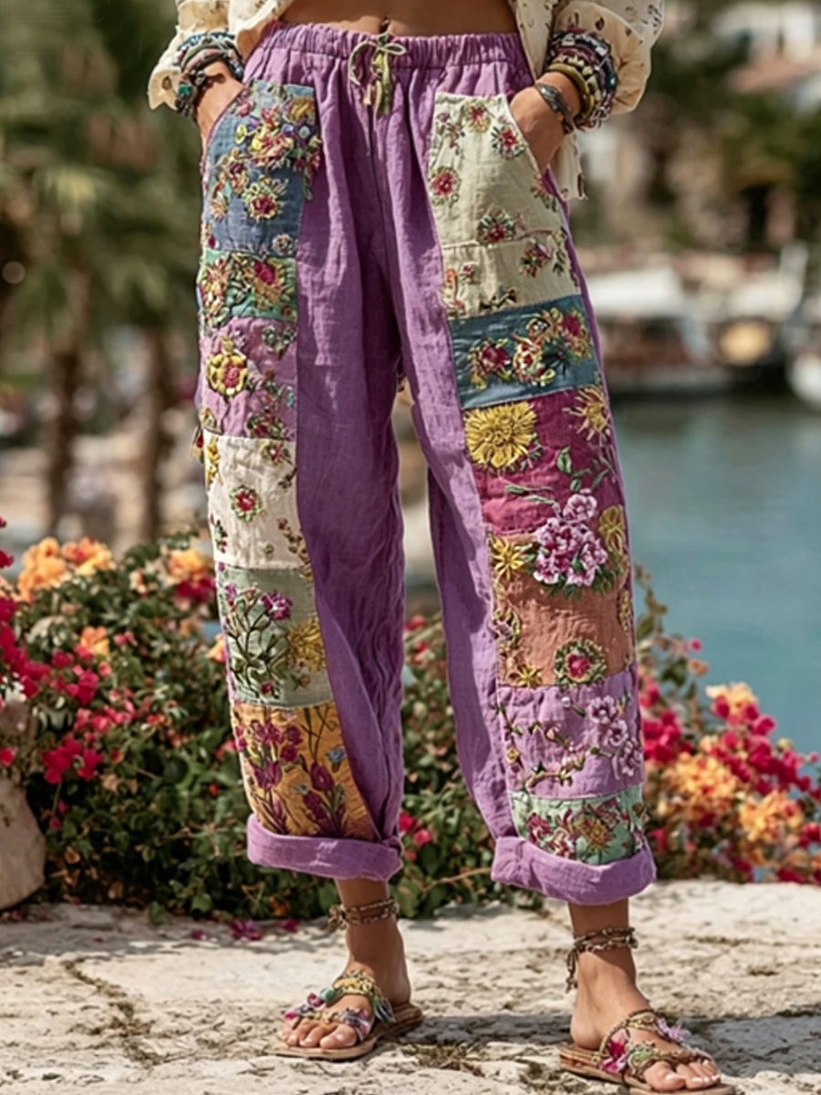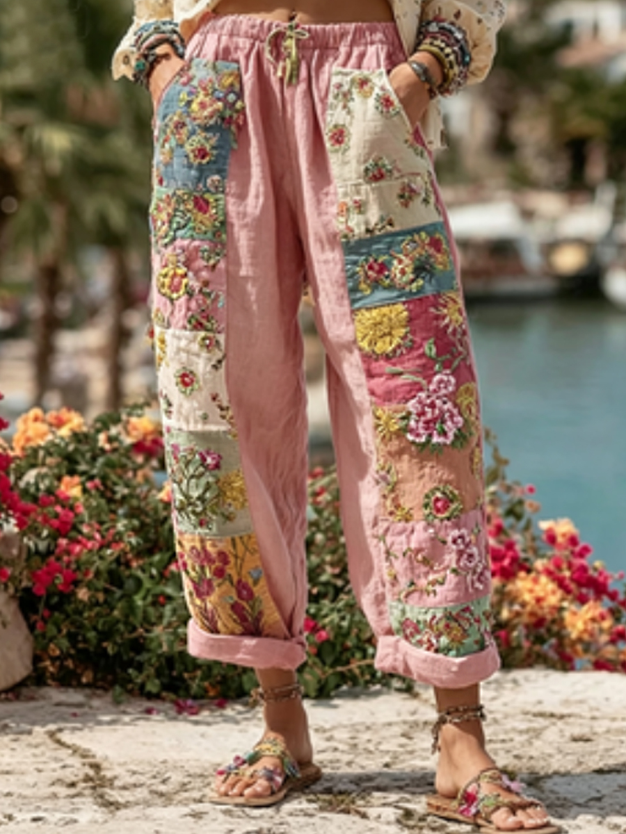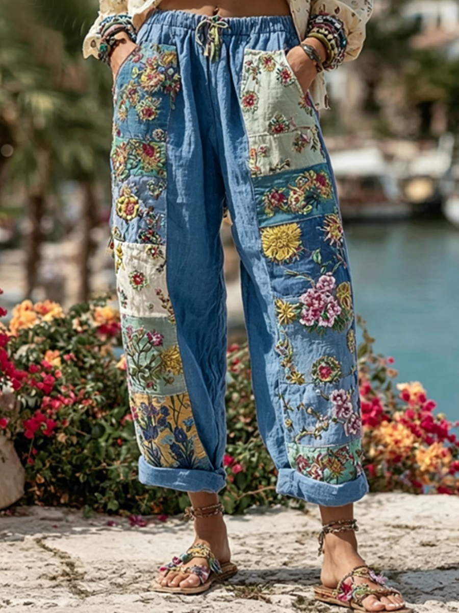Women's Bohemian Floral Embroidery Art Contrast Color Linen Blend Casual Pants