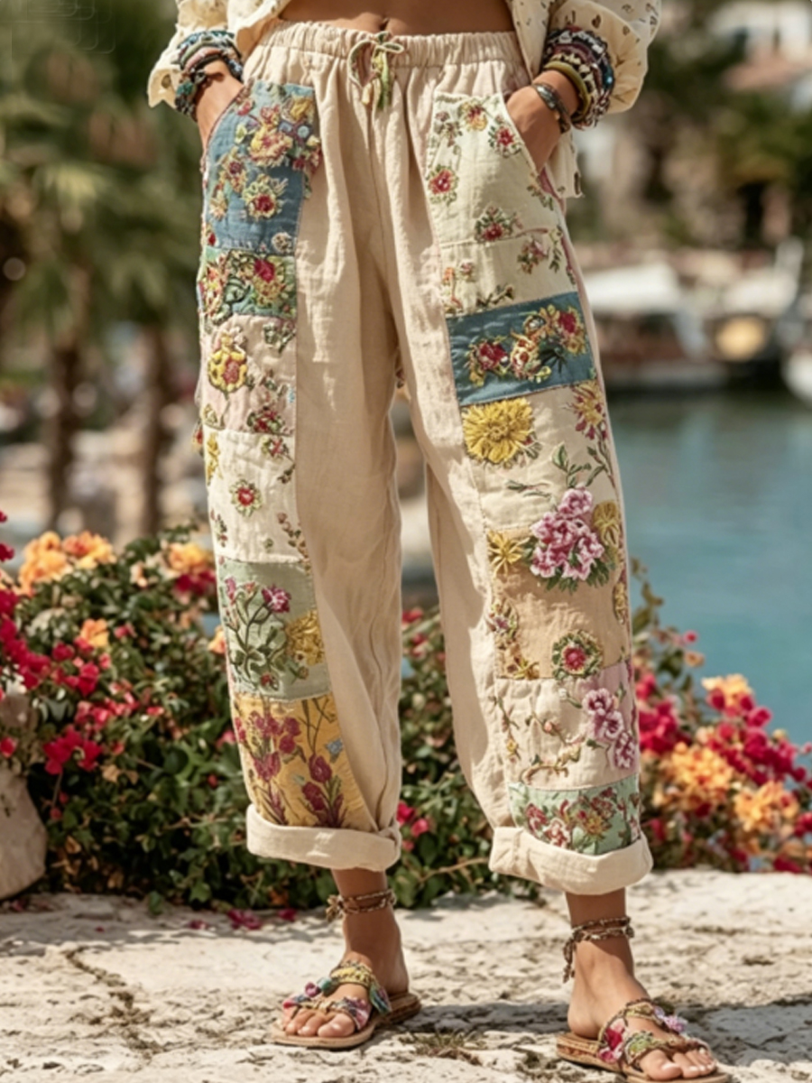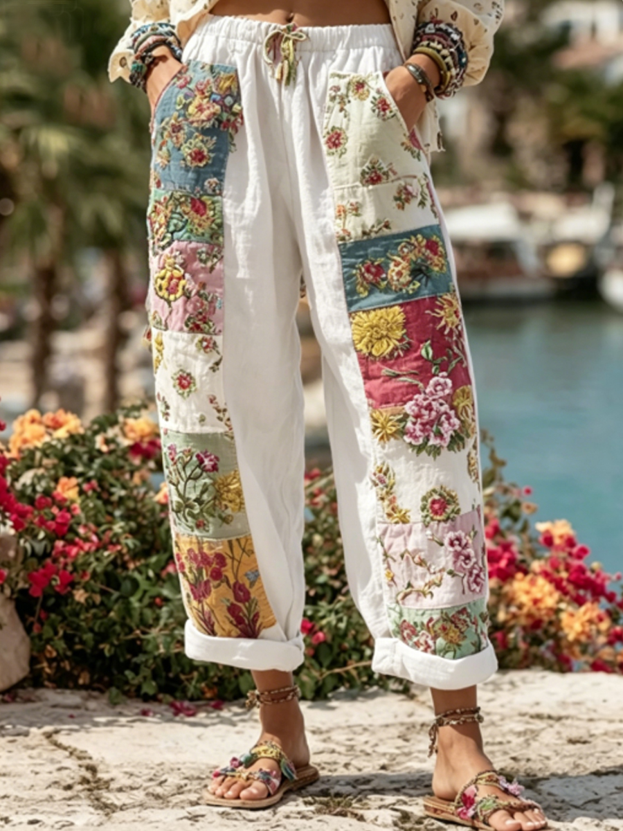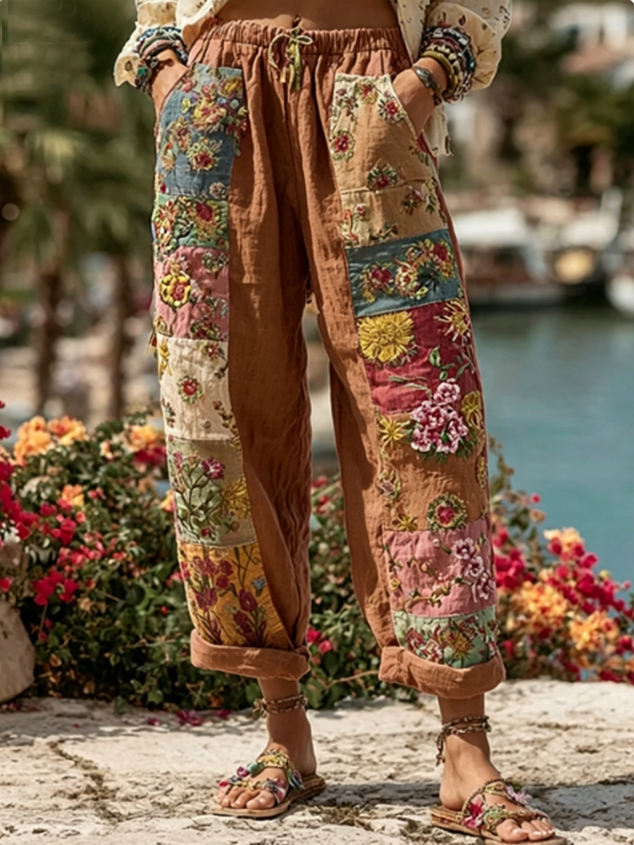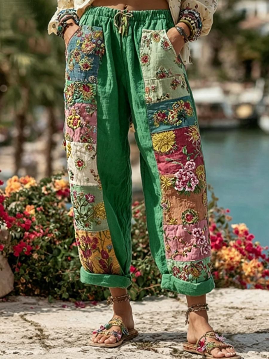 Women's Bohemian Floral Embroidery Art Contrast Color Linen Blend Casual Pants