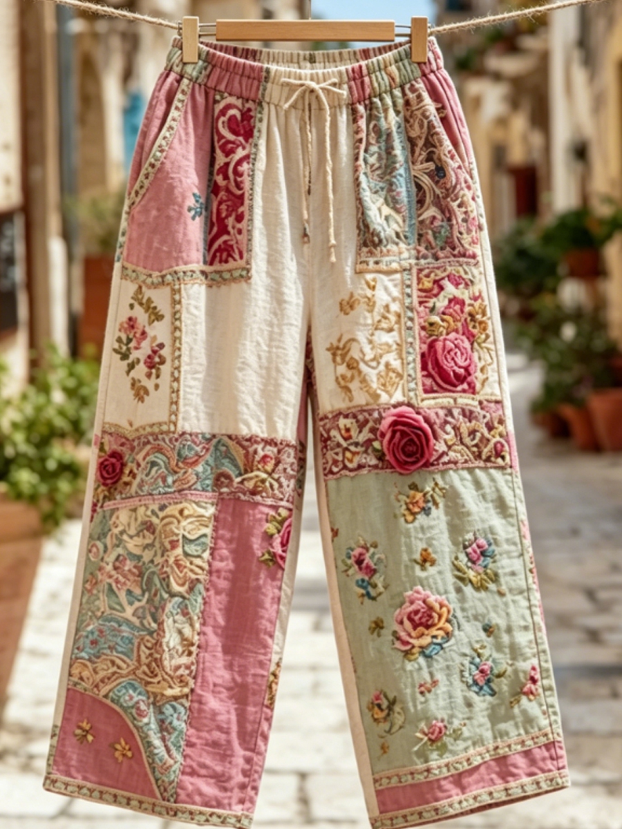 Women's Bohemian Floral Embroidery Art Contrast Color Linen Blend Casual Pants