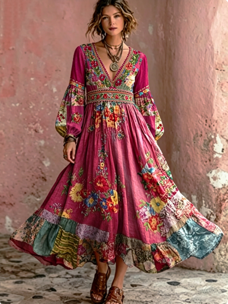 Women's Bohemian Floral Embroidery Art V-Neck Elegant Chic Loose Long Sleeve Maxi Dress