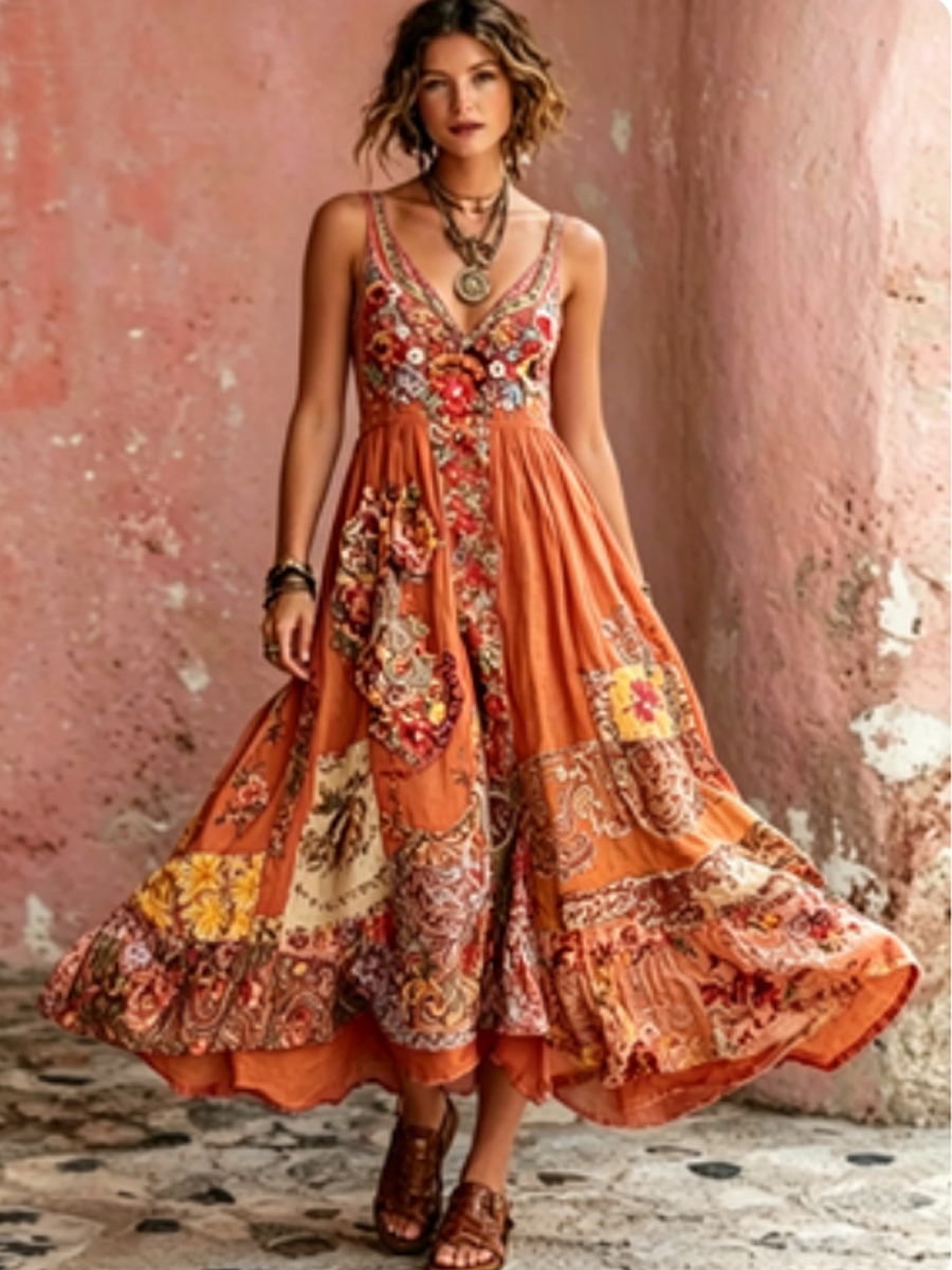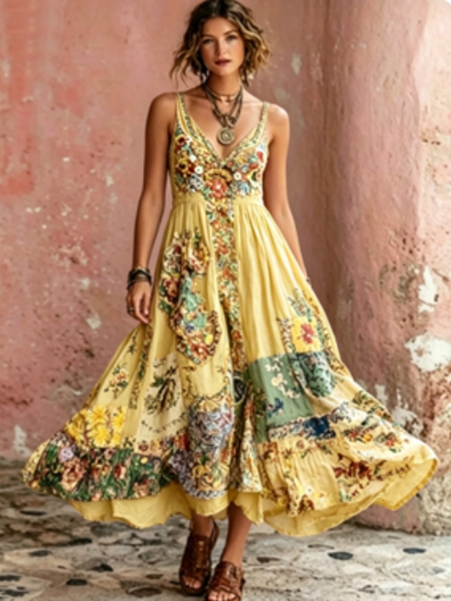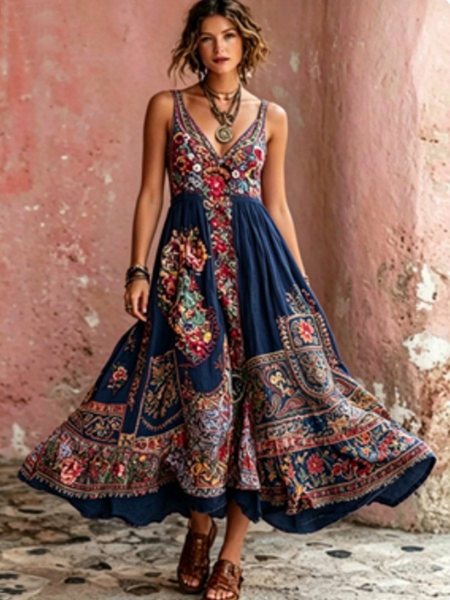 Women's Bohemian Floral Embroidery Art V-Neck Short Sleeve Midi Dress