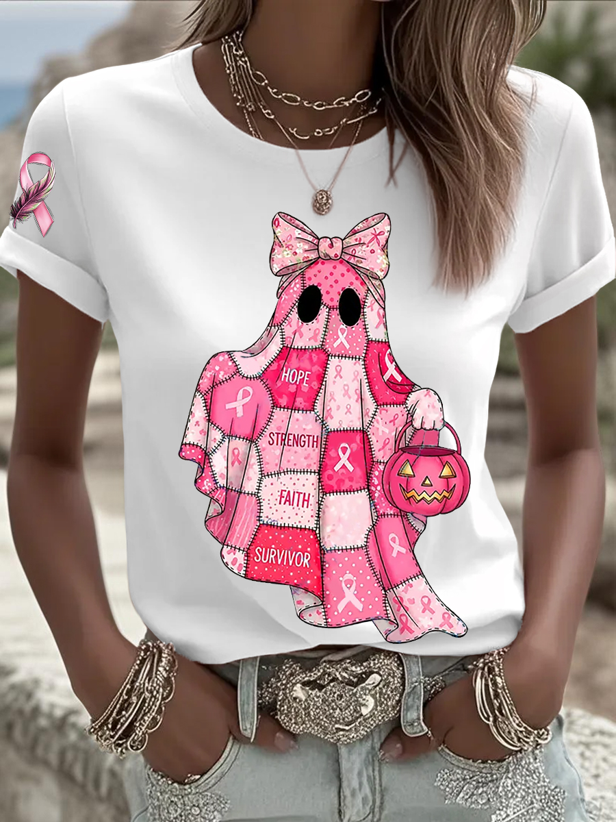 Women's Breast Cancer Awareness In October We Wear Pink Ghost Pink Ribbon Short Sleeve T-shirt