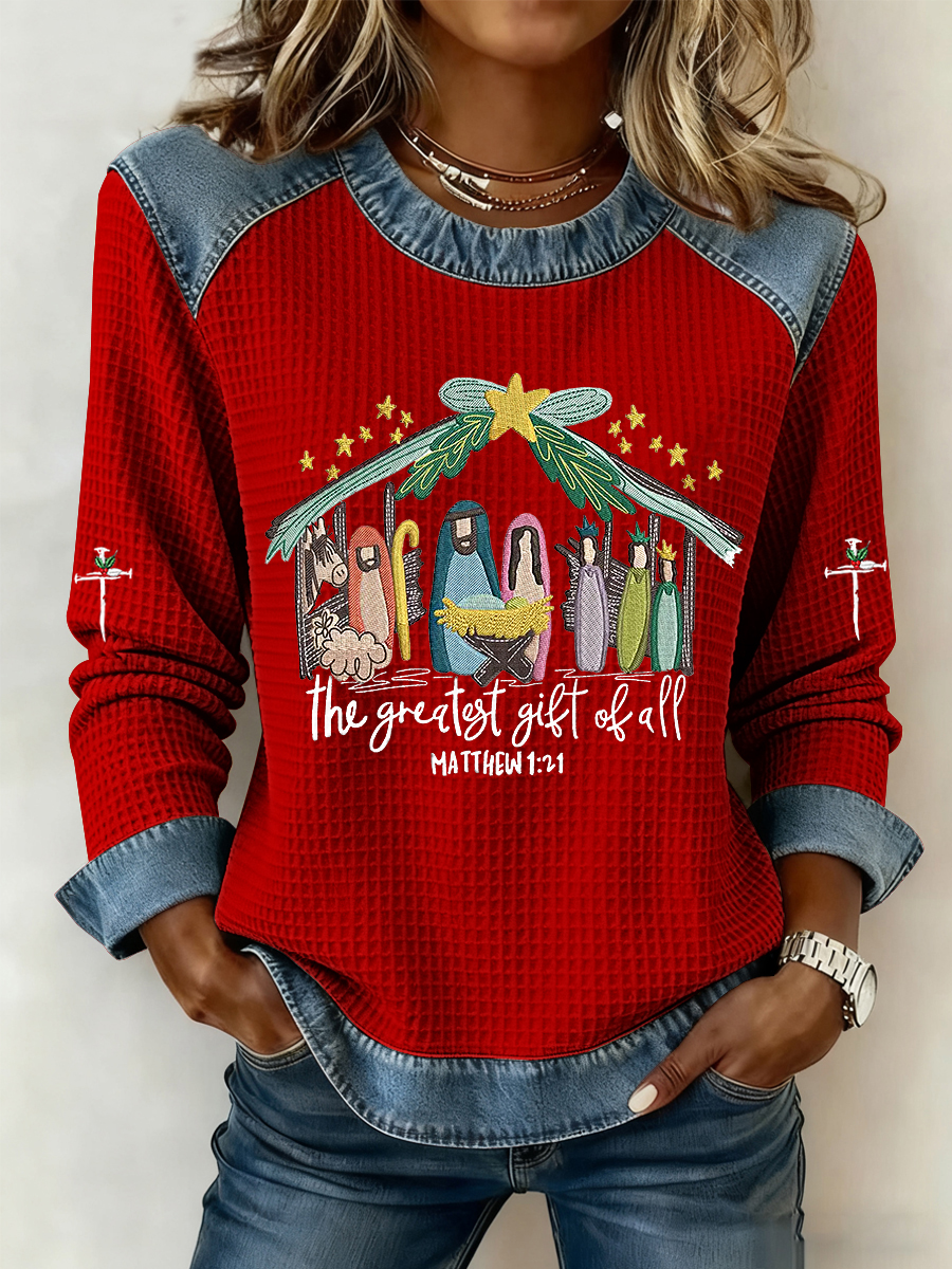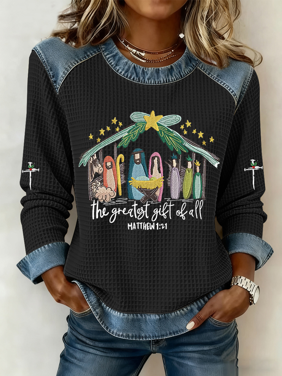 Women's Christian Nativity Scene Greatest Gift of All Waffle Denim Patchwork Top
