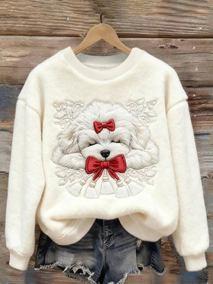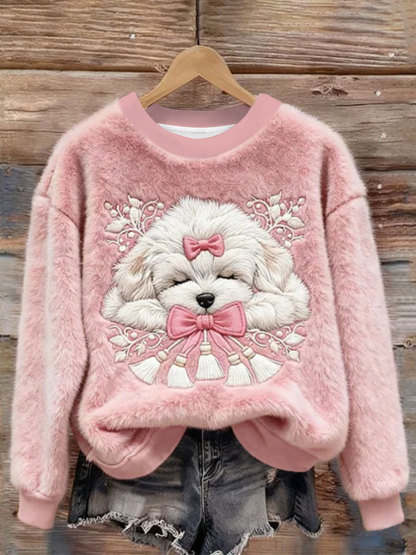 Women's Christmas Sleeping Dog Embroidered Cozy Plush Sweatshirt
