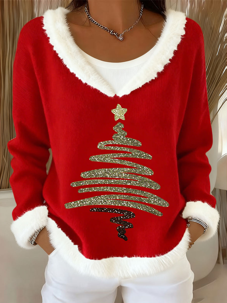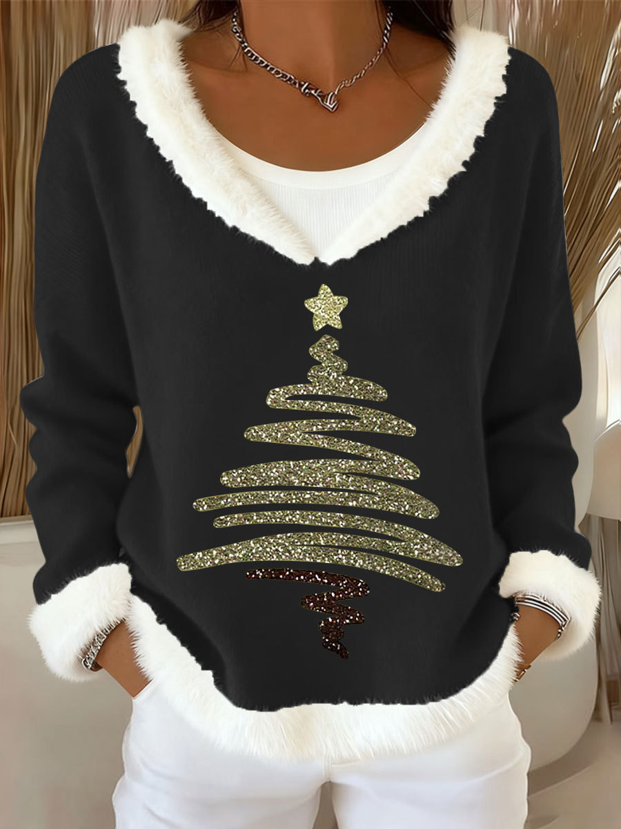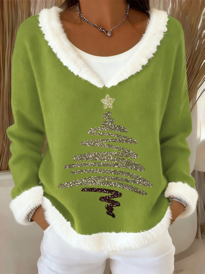 Women's Christmas Tree Art Casual Fur Collar Top
