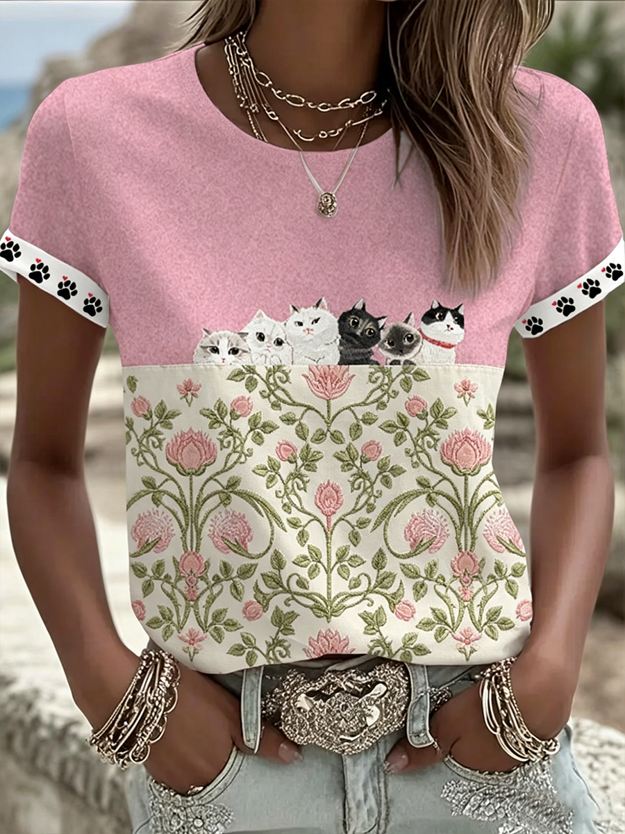 Women's Cute Cats With Floral Graphic Casual Short Sleeve T-shirt