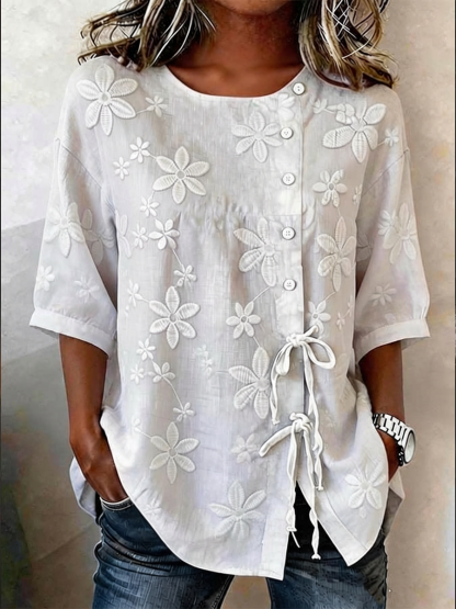 Women's Flowers Buttoned And Laced Linen Blend Shir